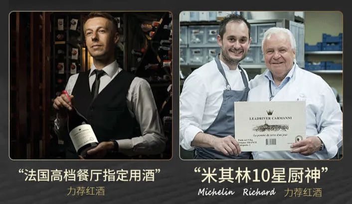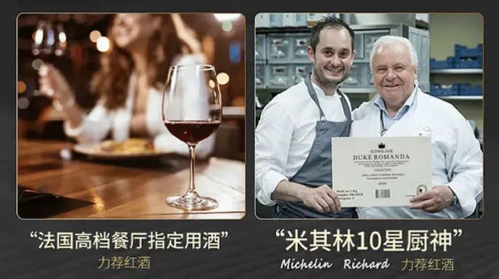 在这款拼多多网红酒的详情页上,外模拿酒的照片旁,还有一张两个外国人手持一张证书的照片,下方写着“米其林10星厨神推荐”与“Michelin Richard力荐红酒”。
