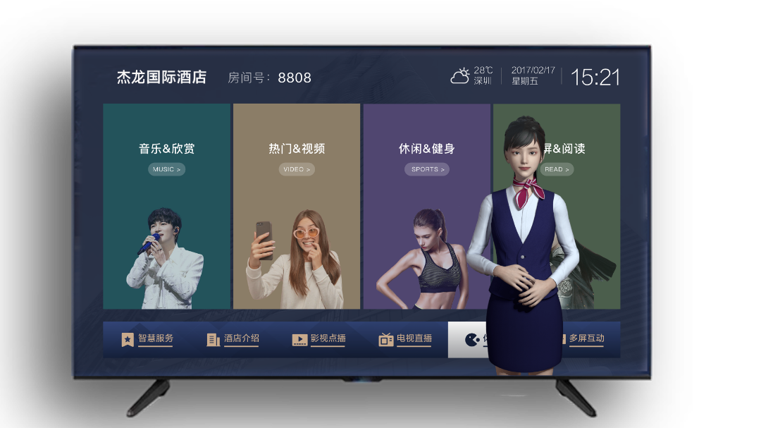 以后,电视也不仅仅是一个播放器、摆饰品,更是智慧酒店所独有的多媒体互动系统。