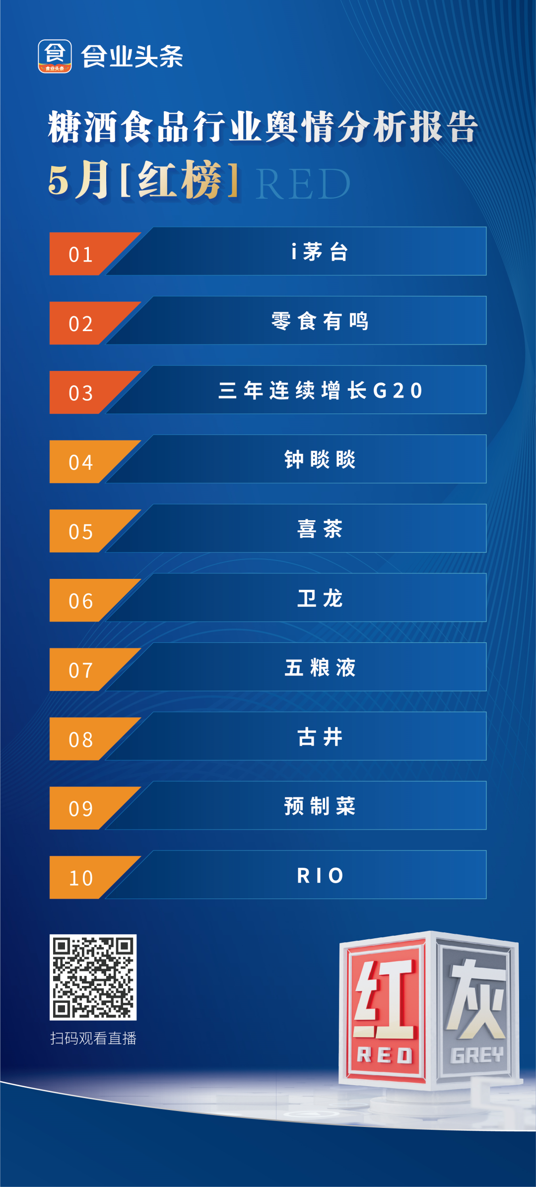 一段舆论在网络发酵,可以让品牌瞬间集齐“万千宠爱”,也能够迅速导致信任危机。截至2022年12月,我国网民规模达10.67亿,同比增长3549万,互联网普及率达75.6%。在这样的网络环境下,厂商更应该爱惜羽毛,以舆情为镜,时刻关注行业风向。基于此,我们以食业头条APP为数据基础每月产出“红榜”和“灰榜”,并对榜单前三进行详细解读——“截至5月18日,i茅台累计注册用户超4000万,累计销售额超230亿元。”5月,茅台旗下数字化营销平台i茅台公布了上线一周年的成绩单。