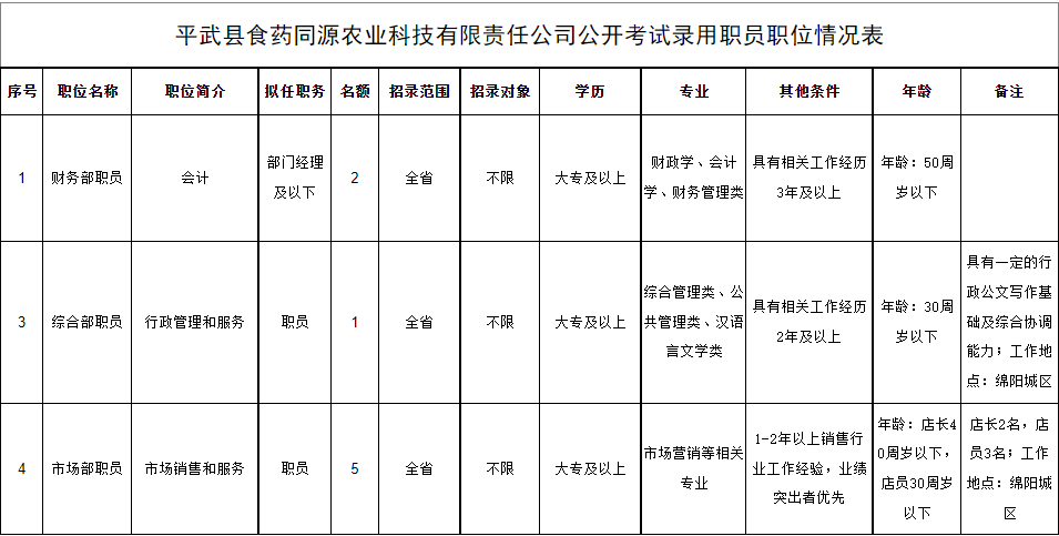 具体招录岗位、名额、招录职位要求的对象、范围、条件详见附件《平武县食药同源农业科技有限责任公司公开考试录用职员职位情况表》。