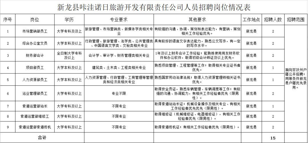 (一)拟面向甘孜州公开招聘工作人员15名,具体岗位及要求详见《新龙县咔洼诺日旅游开发有限责任公司2023年人员招聘岗位情况表》(附件2)。