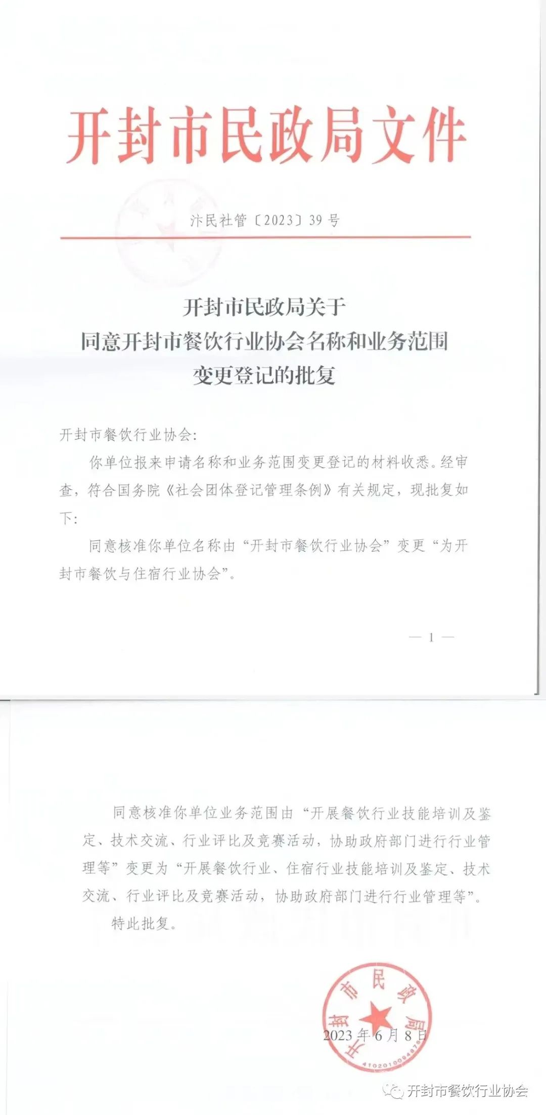 开封市民政局关于同意开封市餐饮行业协会名称名称和业务范围变更登记的批复