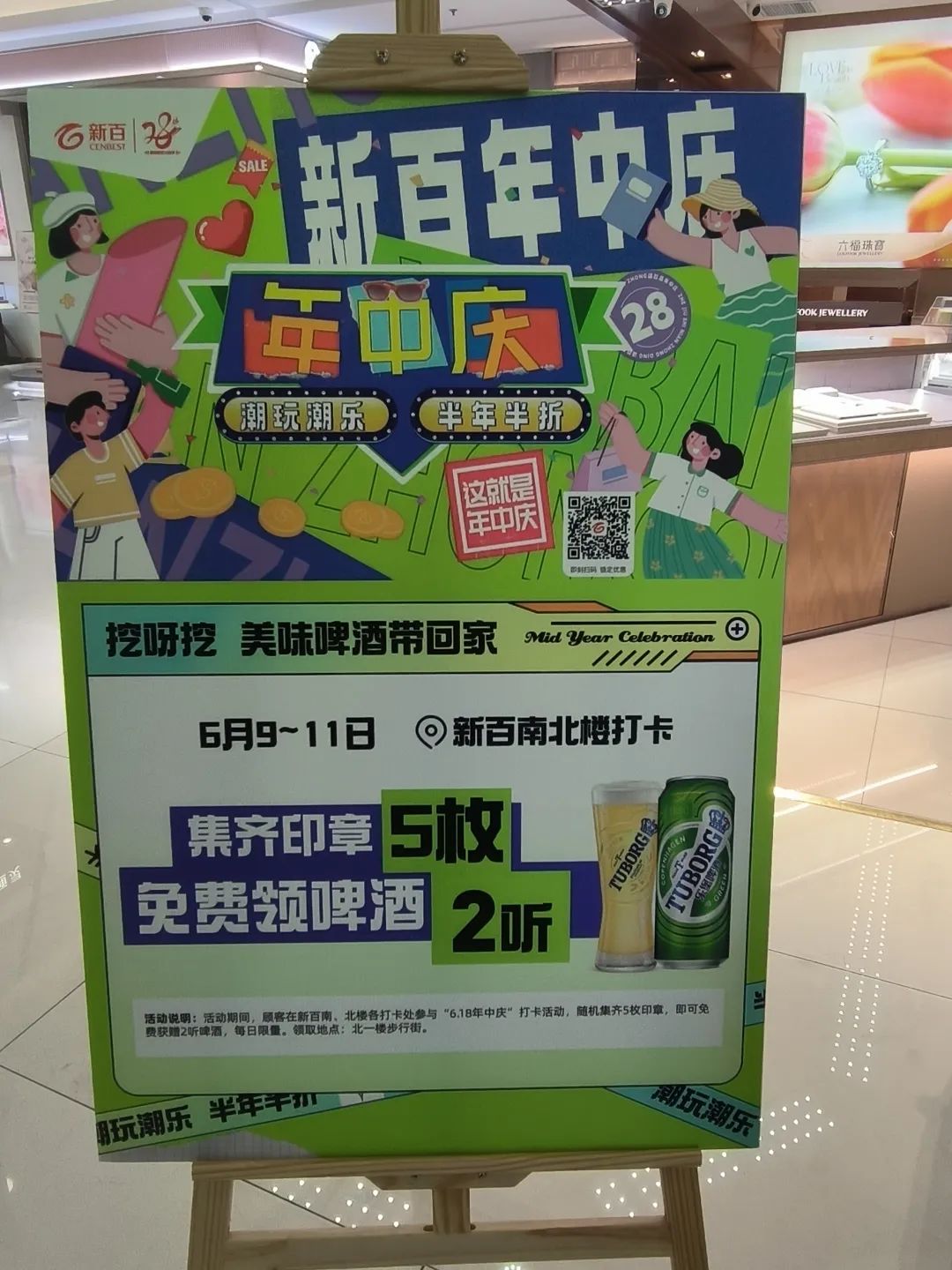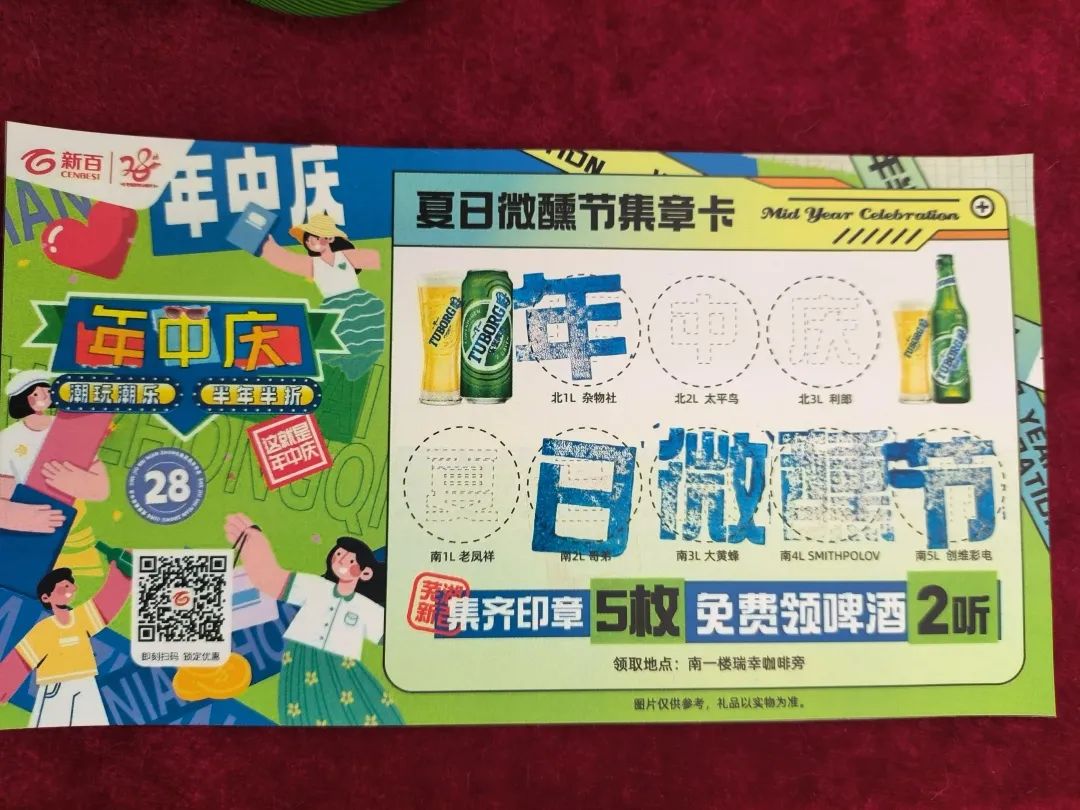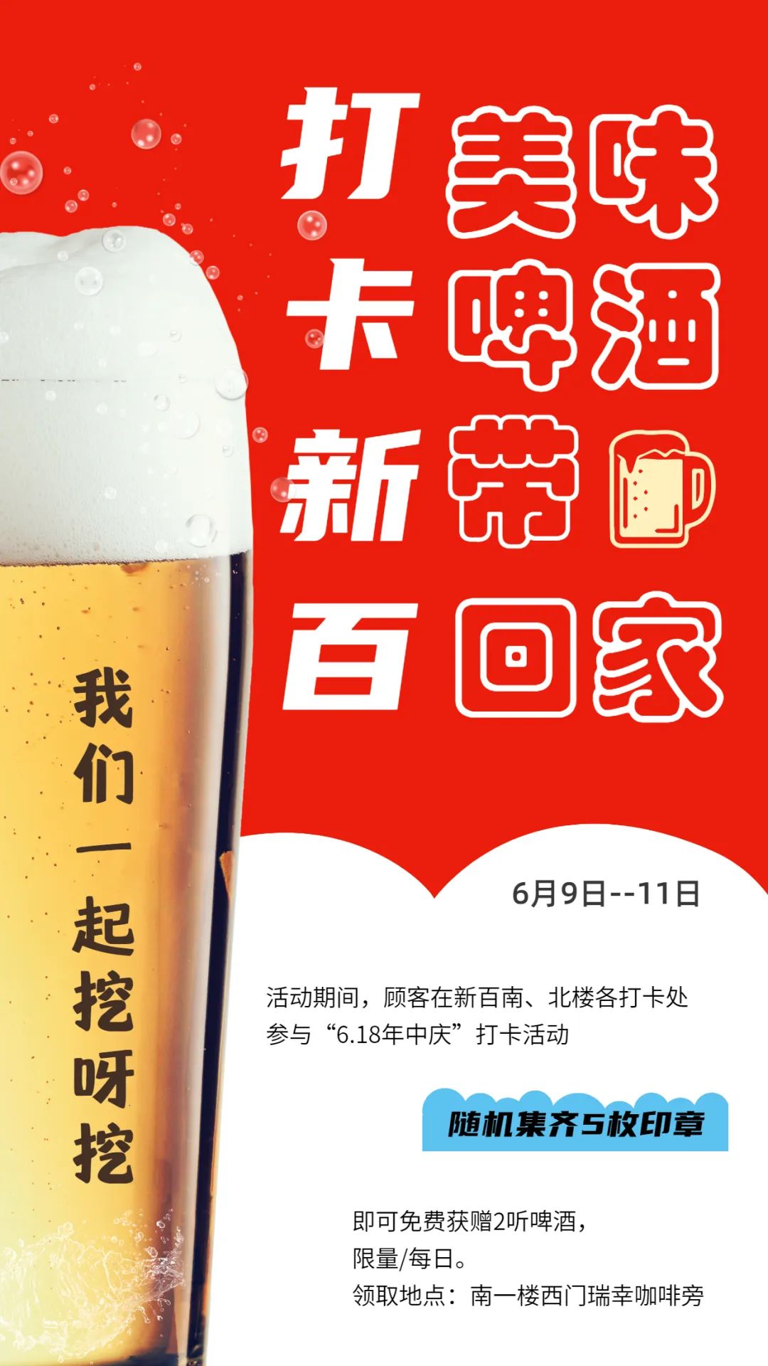 活动期间,顾客在新百南、北楼各打卡处参与“6.18年中庆”打卡活动,随机集齐5枚印章,即可免费获赠2听啤酒,限量,每日。
