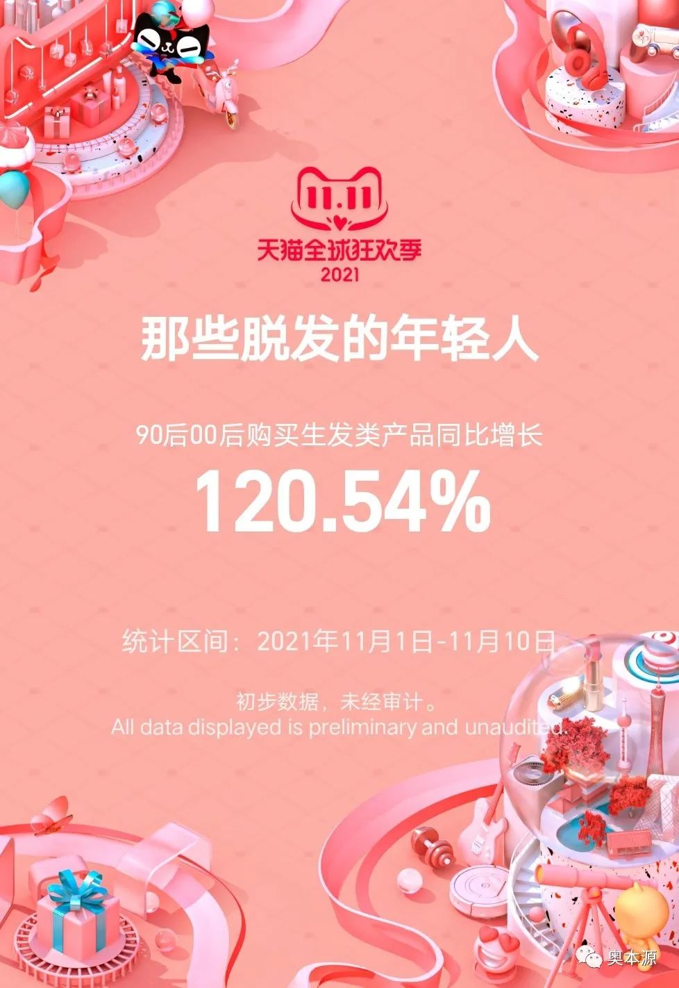 ▷ 根据2021年天猫双11数据显示,双11期间,90后、00后购买生发类产品同比增长120.54%,“生发剂”赫然登上了年轻人消费品搜索榜单前十。