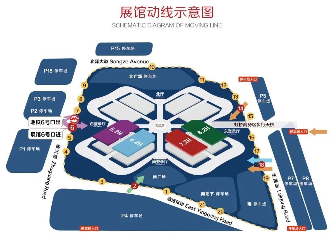 2号线徐泾东站6号口出,左转,由展馆6号口进入。