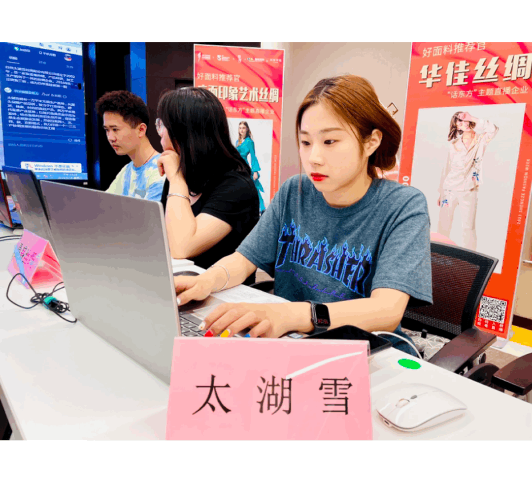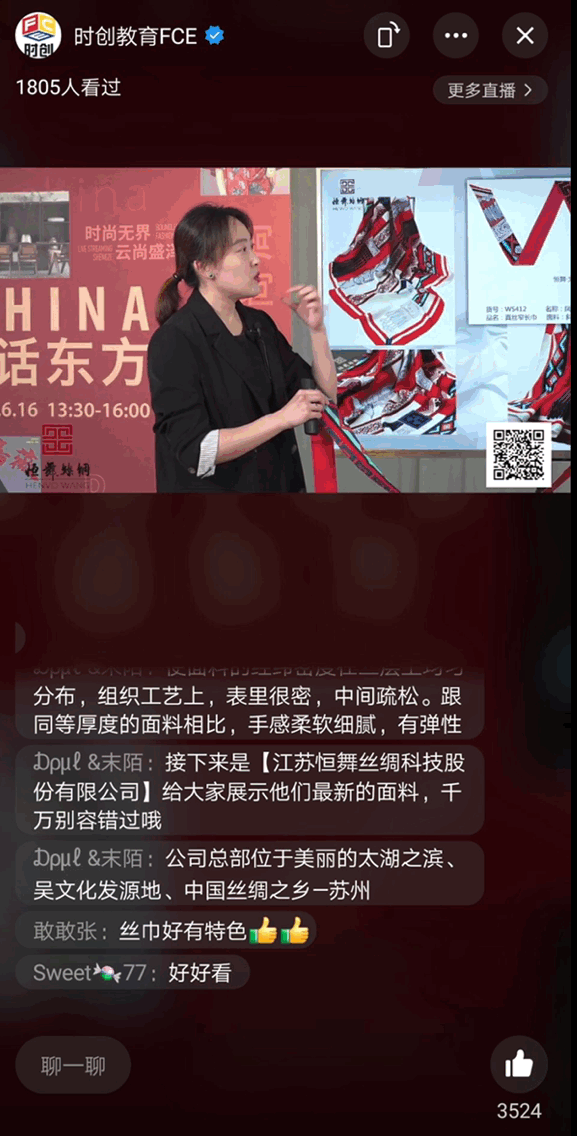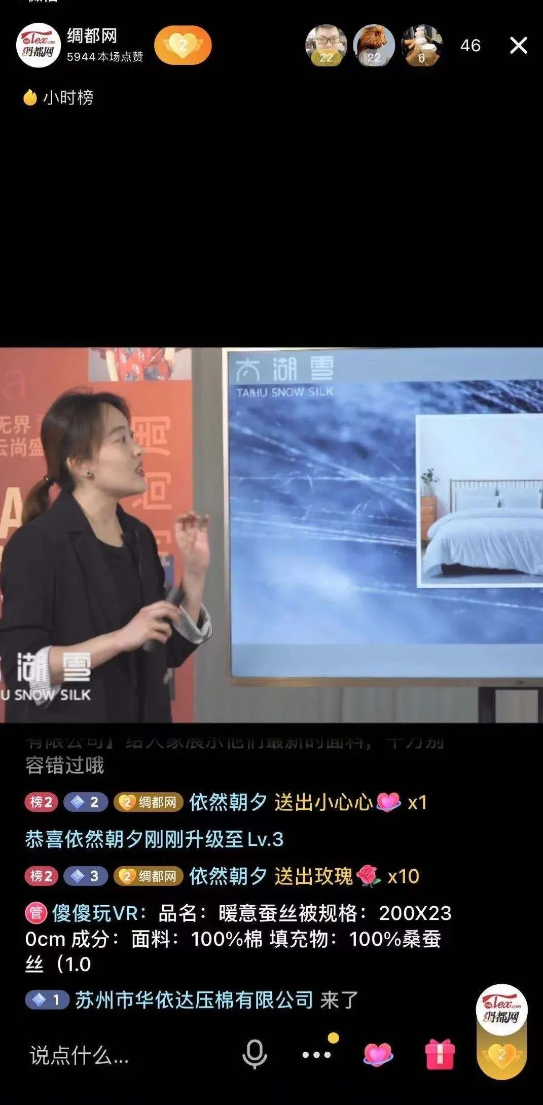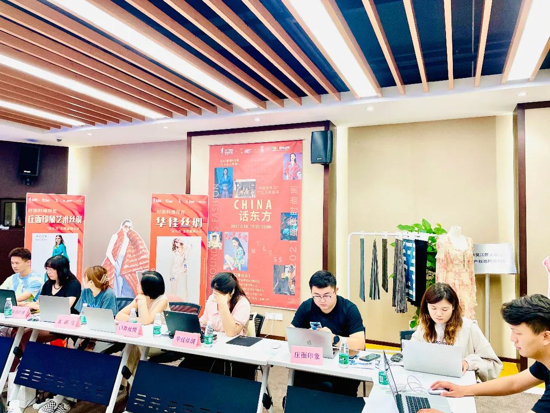 其中,鼎盛丝绸通过采用传统宋锦织造工艺技术,以100%的桑蚕丝为原材料,特殊的工艺配合时尚图案的产品吸引了网友的关注,而庄面印象原创设计、工匠定制、快反生产的高定丝绸时装原创快反生产商理念,同样也受到网友的高度关注,两家企业现场采样调样需求较多。