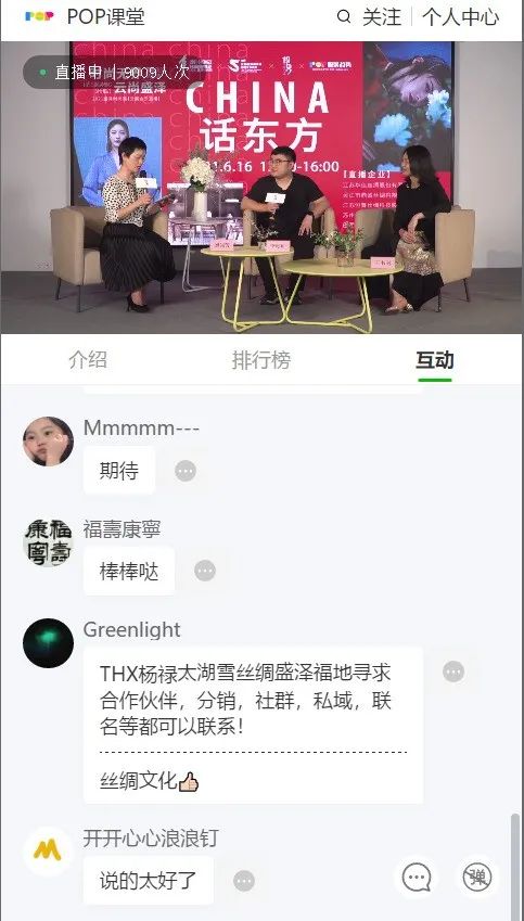 本次大咖论坛吸引浙江锦丝苑丝绸时装有限公司、杭州景宸丝绸服饰有限公司、杭州锦上衣丝绸有限公司、杭州色杰服饰设计有限公司、成都市绱伊族服饰有限公司、杭州歌蕊服饰有限公司、浙江行动者服装有限公司、纯念服饰(深圳)有限公司、广州市喻丝圆实业有限公司、广东都市丽人实业有限公司、宁波中哲慕尚控股有限公司、浙江德清华丝纺织有限公司、杭州意丰歌服饰有限公司、江阴嘉祥贸易有限公司、衣步品牌管理(北京)有限公司、上海衣恋服装有限公司、深圳艾尔莎时装有限公司等众多时尚企业线上观看。