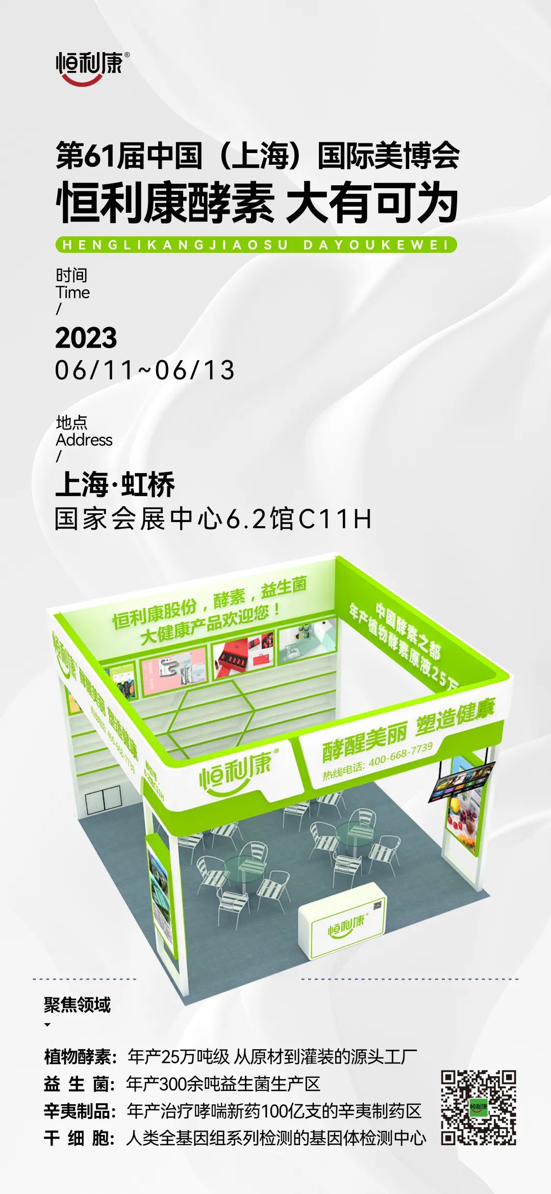 国家会展中心(上海)作为世界规模最大的会展综合体,将充分依托上海的区位优势和辐射能力,立足长三角,服务全中国,面向全世界,为中国美业发展做出了积极的贡献。 本次展会,恒利康将携旗下益生菌、酵素、精油、饮品等全系产品亮相现场,期待您莅临恒利康展位深度参与,我们期待与您相遇!