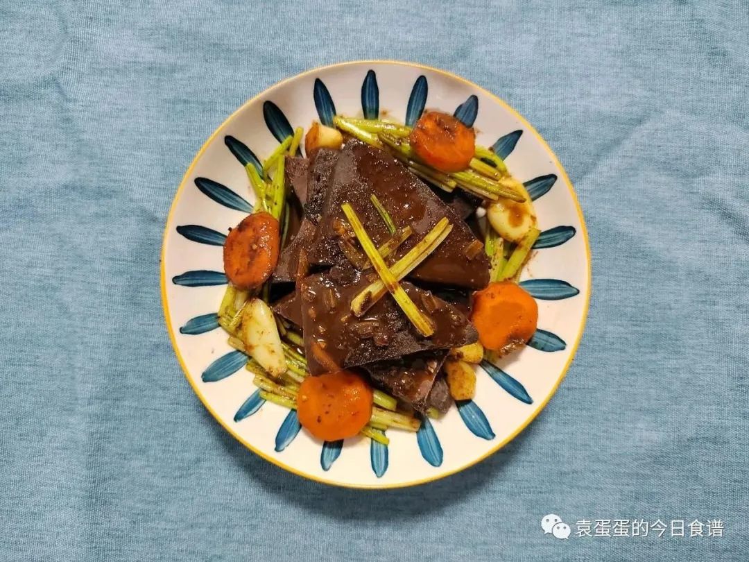 胡萝卜切成圈圈状、香芹去掉叶子切成梗,加入桂皮一节、八角两颗、十几粒胡椒碎,倒入清水加盐、糖、生抽调一个很轻的鲜甜口蔬菜汤,煮开后立刻关火。