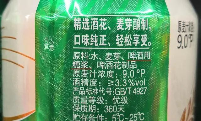 有的啤酒即使原麦汁浓度有11°,但原料表上表示着“啤酒糖浆”或“大米”这2个词的,虽然价格便宜,但是无论是味道和口感都差强人意,最好不要买。