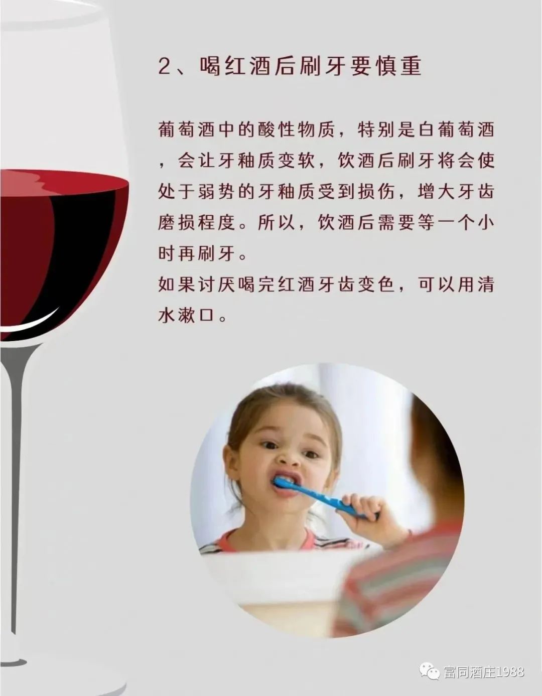 2.喝酒后马上刷牙会提高牙齿长期被着色的可能性。葡萄酒中的酸会软化牙釉质,然后单宁和色素就会粘着在牙齿上。若人们在喝酒后马上刷牙,酸就会将此时软化的牙釉质彻底破坏腐蚀。所以,建议大家用漱口水漱口或者隔一段时间后再用比较软的牙刷刷牙。