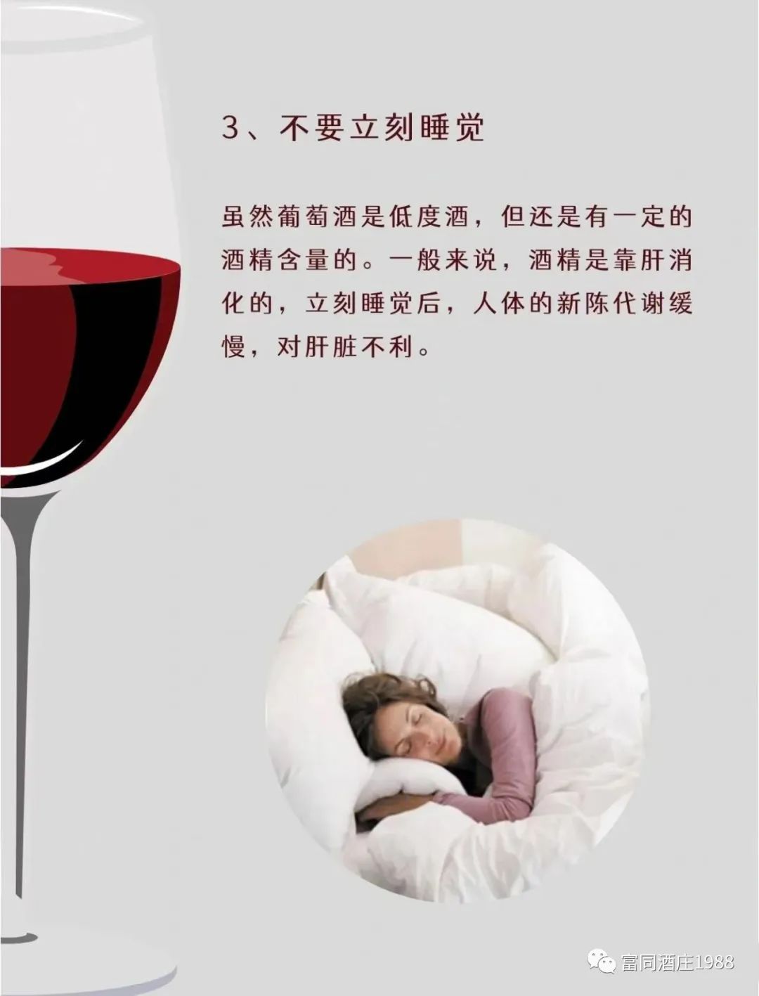 3.喝完酒之后是不能立马睡觉的。因为机体在睡眠状态时肝脏的代谢速度也会变慢,如果喝完酒之后立马睡觉的话就会影响到酒精在身体内的代谢,这样就会加重醉酒症状。并且酒精对呼吸道的肌肉能起到一定麻痹和松弛的作用,喝酒之后立马睡觉会容易出现鼻塞、鼻充血的情况,因此建议喝完酒之后最好要等酒醒的差不多时再去睡觉。