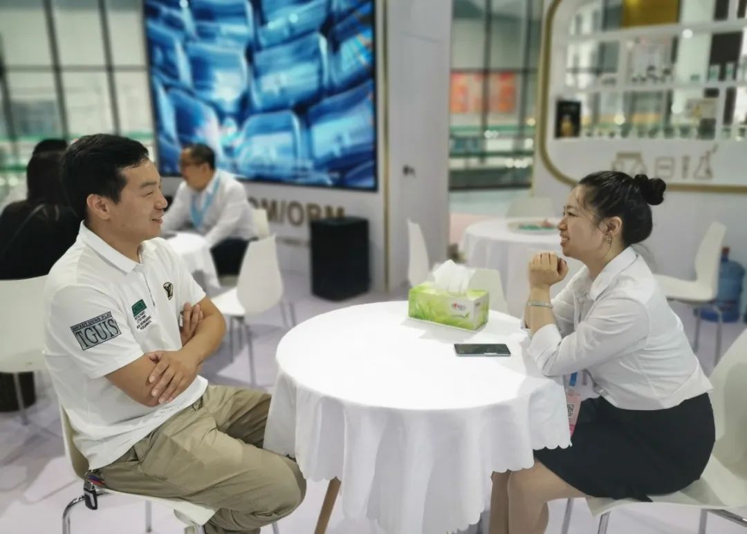 在美博会展位现场,雅蘭國際迎来了美博会创始人马娅会长的亲临。她亲切地与我们团队交流,对雅蘭國際的表现给予了高度赞赏和认可,认可我们对市场趋势和消费者需求的敏锐洞察力,以及我们持续创优,追求卓越品质的精神。