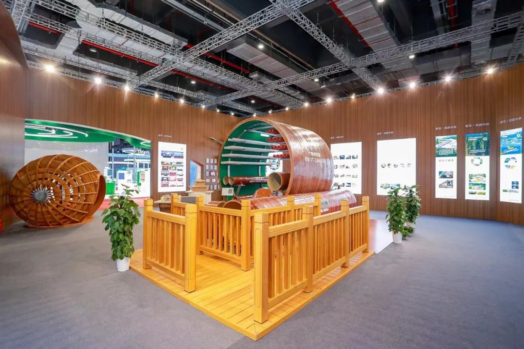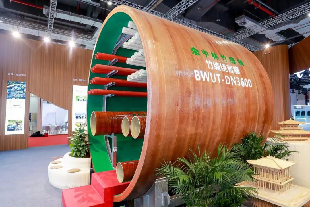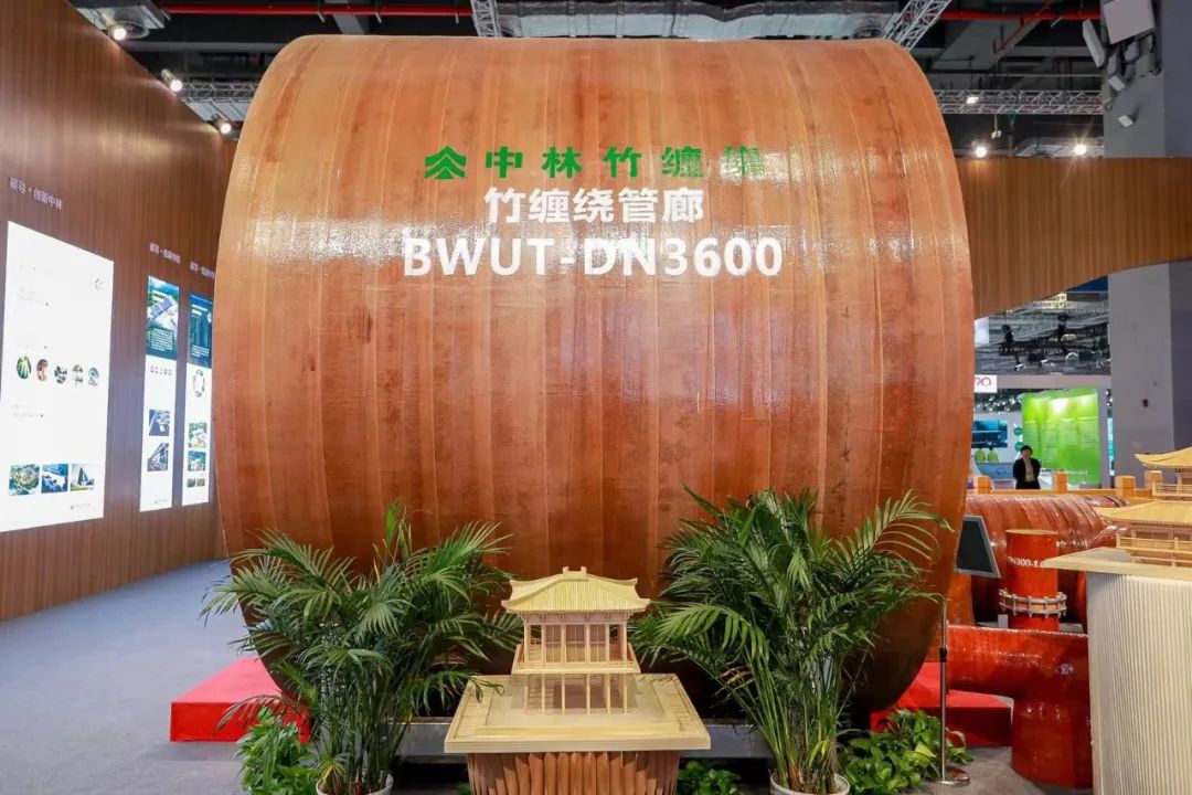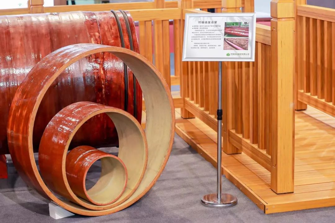 近年来,中林集团不断加强竹缠绕新型复合材料研发,为生物减碳固碳提供重要解决方案。在现场,一个直径为3.6m,长3m的竹缠绕管廊吸引了大家的注意,它是“以竹代塑”绿色低碳材料应用的创新与突破。与传统管廊相比,竹缠绕管廊材料成本可降低约10%,安装施工效率可提高约20%。竹缠绕管廊于2022年7月,在住建部的建设行业科技成果评估中被评为“技术达到世界领先水平”,并列入“十四五”生物经济发展规划。