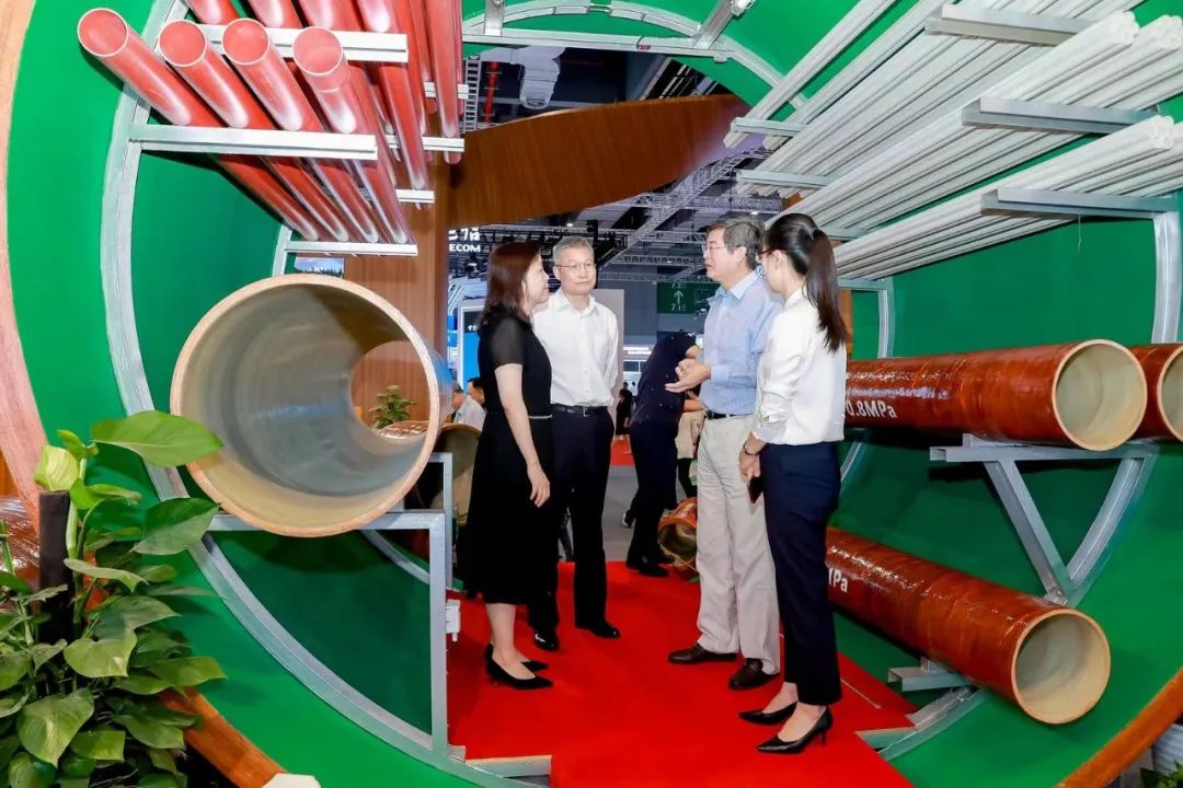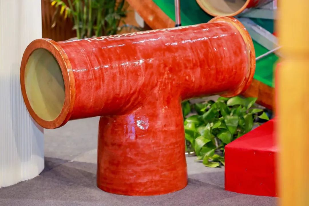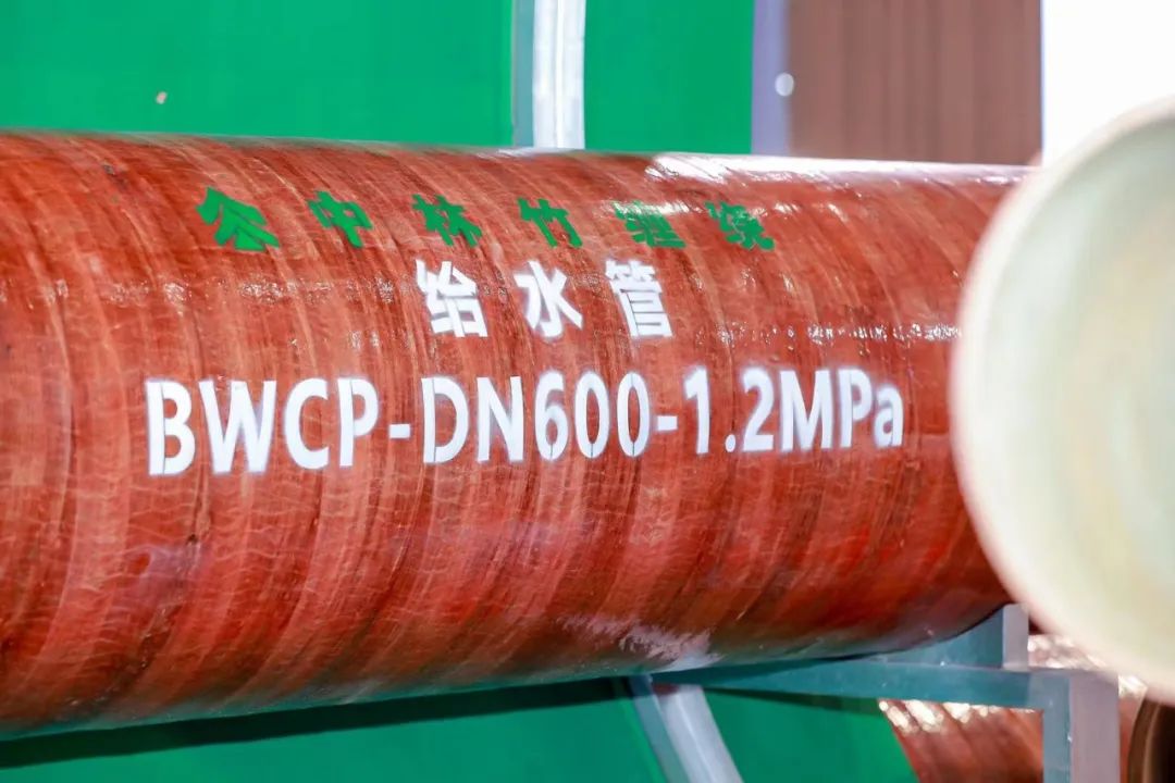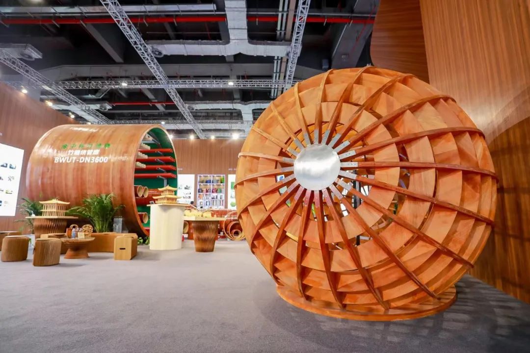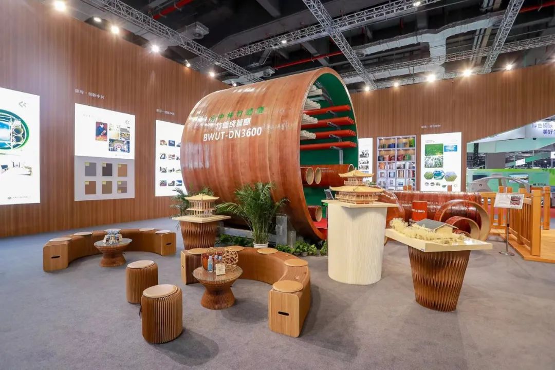 近年来,中林集团不断加强竹缠绕新型复合材料研发,为生物减碳固碳提供重要解决方案。在现场,一个直径为3.6m,长3m的竹缠绕管廊吸引了大家的注意,它是“以竹代塑”绿色低碳材料应用的创新与突破。与传统管廊相比,竹缠绕管廊材料成本可降低约10%,安装施工效率可提高约20%。竹缠绕管廊于2022年7月,在住建部的建设行业科技成果评估中被评为“技术达到世界领先水平”,并列入“十四五”生物经济发展规划。