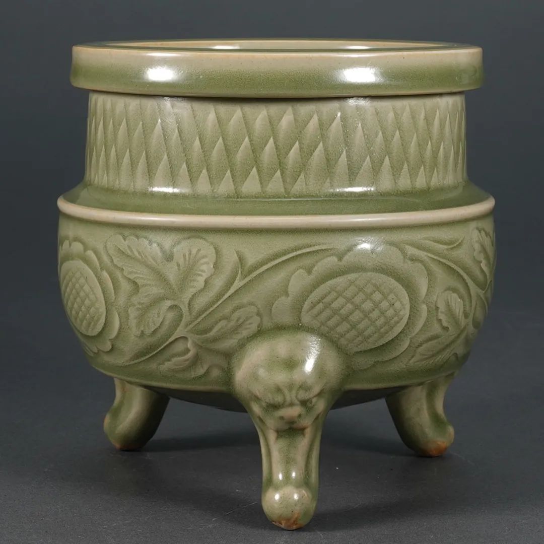 说明:本品造型古朴雅致,平沿、束颈、短颈、扁圆腹,下承三兽足,足端露胎,外壁施青釉,釉层晶莹肥厚。炉身腹部主题纹饰刻缠枝花卉,刀法犀利爽捷,花纹清晰。另耀州窑三足炉十分少见,颇为难得。本品造型庄重质朴,釉色素雅宜人,可称是耀州窑的一件精工力作。