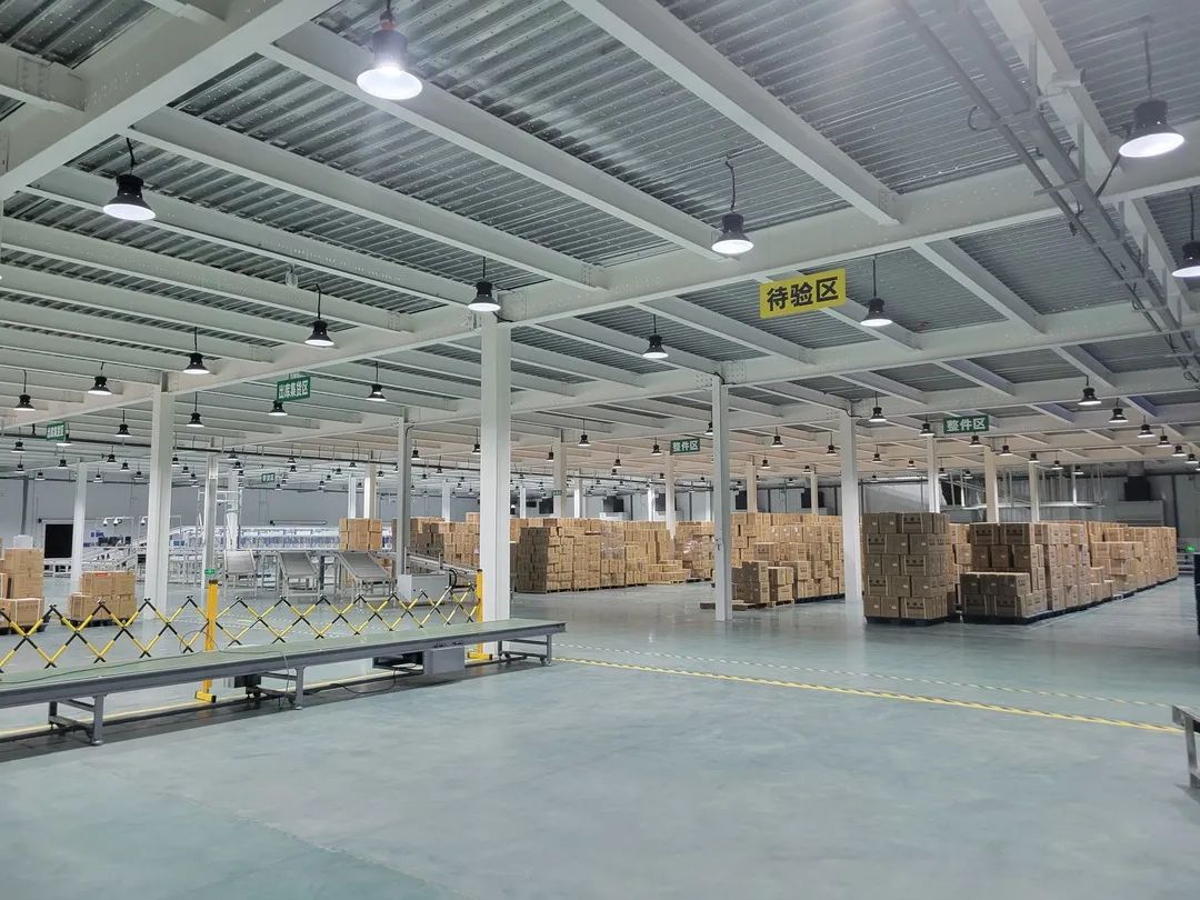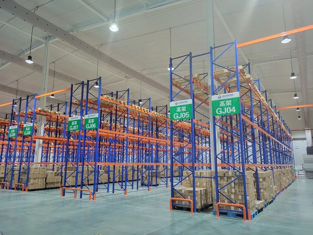 仓储中心一层设有6米高位立体货架,由16组4层的重型货架组成,设计存货量为1600个托盘40000箱货,前期配合两台高位叉车可支持每小时40个托盘的出入库操作。