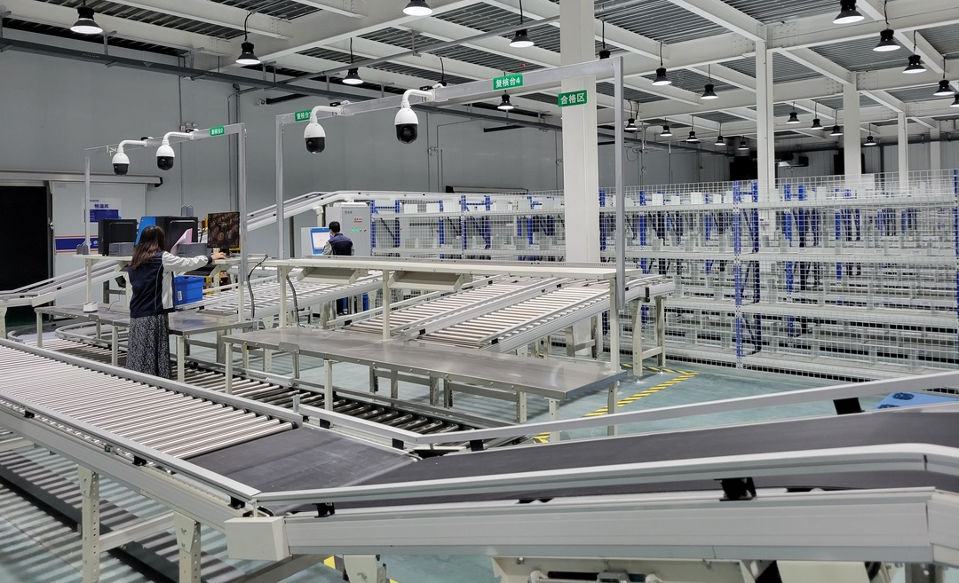 拆零区,功能库,地堆区,高架货位总存储量近70000件,配备自动分拨线和螺旋升降机,5个拣选分拨口,4个复核打包口,支持每小时分拨复核订单近800条。