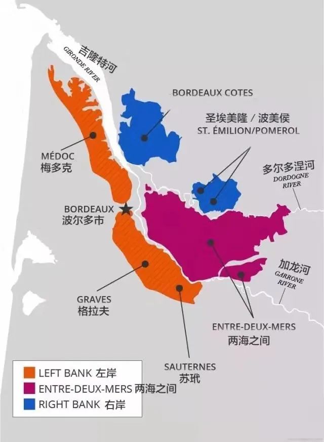 波尔多位于法国西南,境内有三条河流:吉伦特河(Gironde)、多尔多涅河(Dordogne)、加隆河(Garonne),将波尔多分为“人”字型的分为三个部分:左岸、右岸、两海之间。