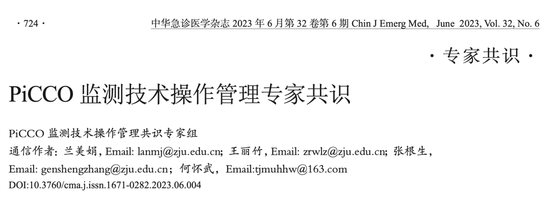 PiCCO 监测技术操作管理共识专家组. PiCCO 监测技术操作管理专家共识[J]. 中华急诊医学杂志, 2023,32(6): 724-735.