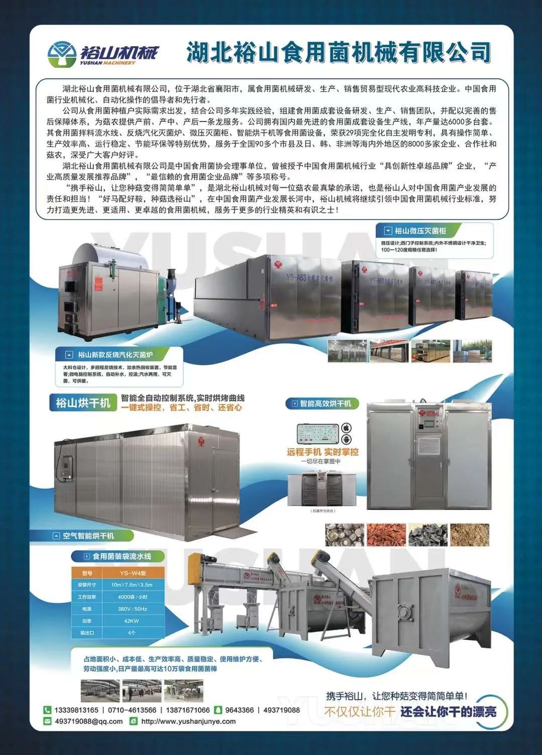 湖北裕山菌业有限公司是一家集菌种生产、食用菌种植、菌菇培植整场设计、原辅料经销、食用菌成套设备产销研、数字化管理服务为一体的全产业链企业,荣获国家高新技术企业,产品通过(GB/T19001-2016/ISO9001:2005)质量管理体系标准认定。产品畅销全国多个省市并远销海外,深受广大企业、合作社和菇农好评和厚爱。《裕山食用菌灭菌柜走出国门,发往非洲刚果!》、《喜讯!再获国企大单,裕山菌菇装备助力菌业发展!》(点击划线题目进入阅读)