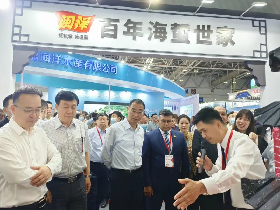 福建省副省长王金福(左)、原农业农村部副部长于康震(中)、福州市市长吴贤德(右)莅临闽洋海蜇展位(7E17)参观指导,闽洋海蜇第三代传承人王坤建为各级领导介绍福州海蜇产业链及闽都塔(海蜇)古宴文化。