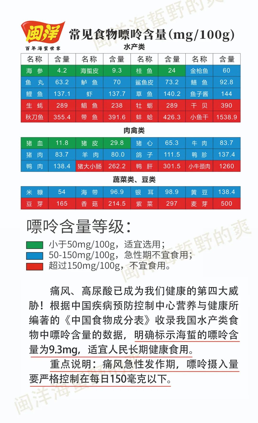 图为《中国食物成分表》收录我国水产类食物中嘌呤含量的数据,明确表示海蜇的嘌呤含量为9.3mg,适宜人民健康食用。