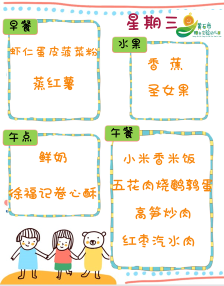 膳食管理是幼儿园管理工作中至关重要的组成部分,事关幼儿的营养与健康。《幼儿园教育指导纲要(试行)》指出:“幼儿园必须把保护幼儿的生命和促进幼儿的健康放在工作的首位。”因此,实幼严格遵照《幼儿园工作规程》的要求——为幼儿提供安全卫生的食品,编制营养平衡的幼儿食谱,保证幼儿合理膳食。让我们一起来看看实幼营养健康的美食吧!