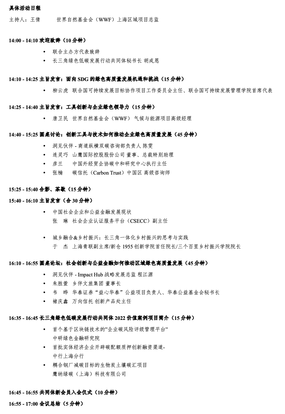 为响应国家战略号召,适应时代发展要求,构建有利于绿色发展的商业战略和商业模式,提高企业的可持续性价值。2023年6月上海碳博会 “Demo Zero 长三角创新日”期间,我们将邀请区域发展专家、低碳转型先行企业以及在社会企业以及公益金融领域的实践者共同分享在推动企业自身或者社区等主体绿色转型中的经验与挑战,共同探讨在长三角区域绿色高质量发展过程中的合作机遇。