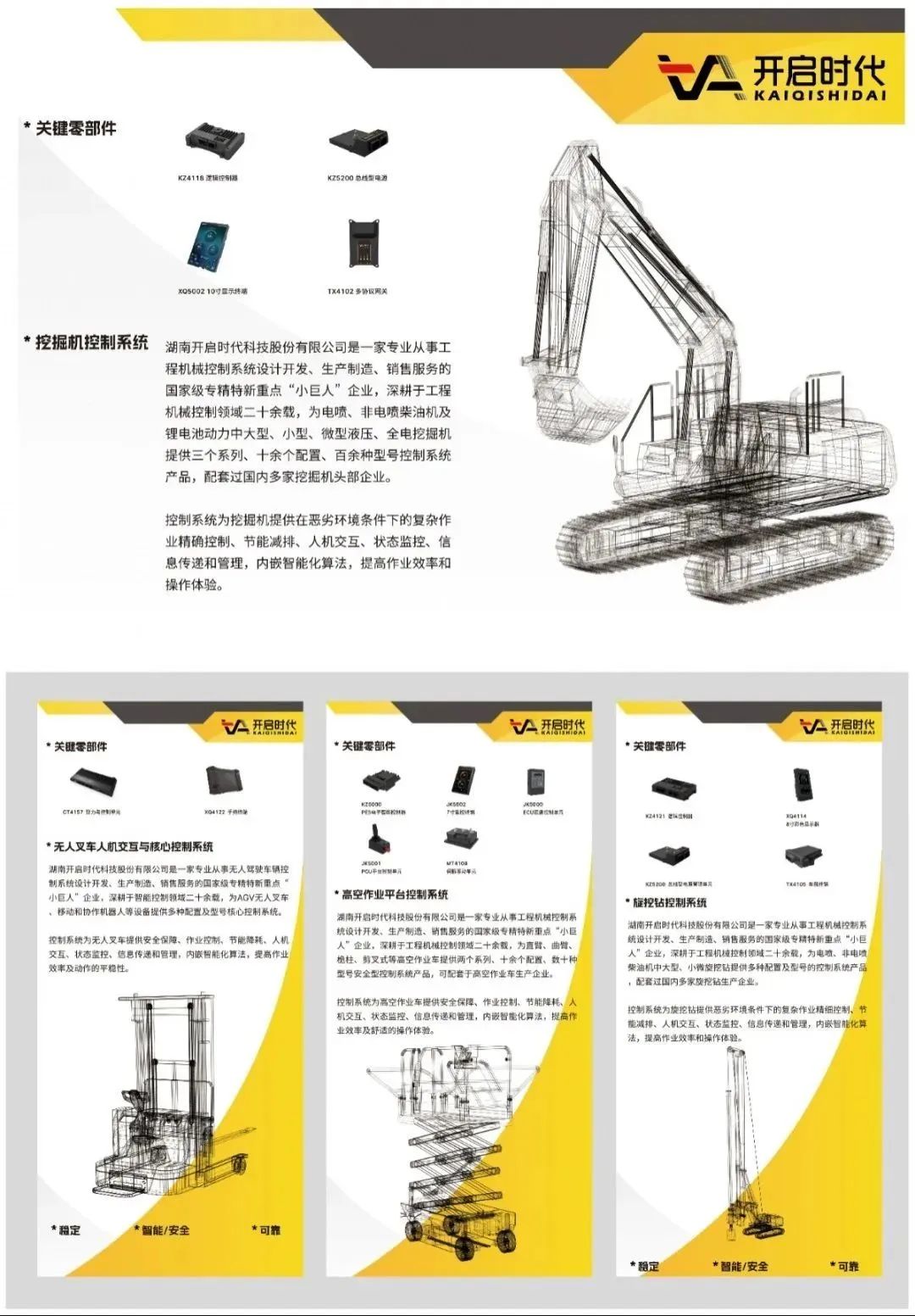 核心产品剪叉式高空升降平台控制系统、挖掘机控制系统、无人叉车人机交互与核心控制系统及旋挖钻控制系统,彰显着开启时代在工程机械道路上的实力与担当。