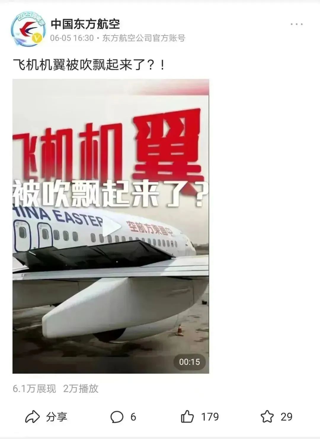 抖音、快手共发10期内容,总播放量78.6万。飞机机翼被吹飘起来了?!其实这是飞机扰流板,在地面打开主要是提供阻力,和发动机的反推一样,都是在降落后给飞机减速刹车的。