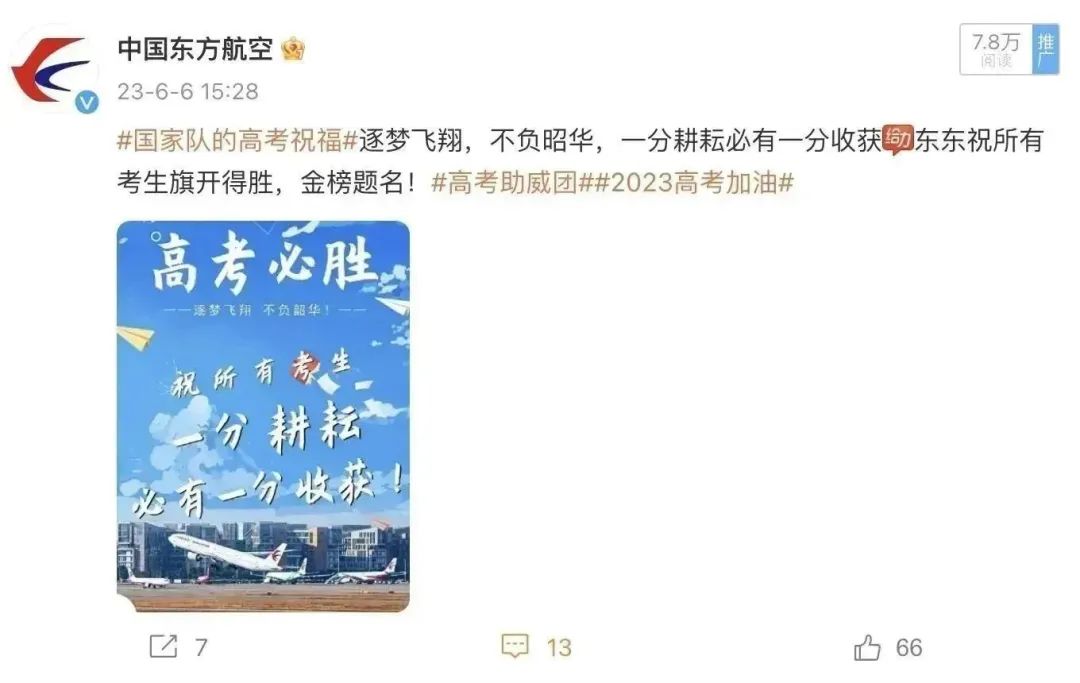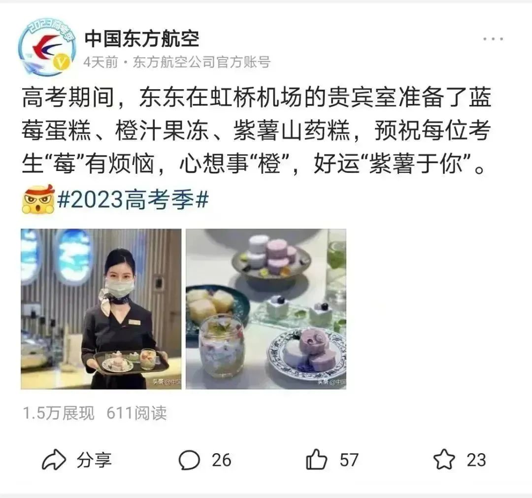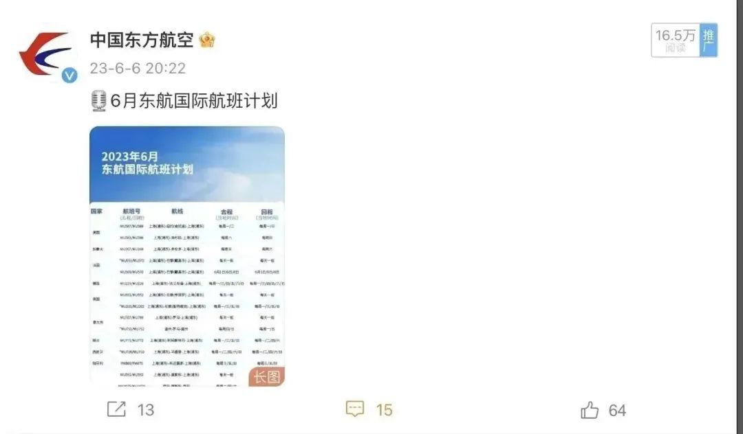 微博共发布33期内容,总流量达153万。来自东东的高考祝福,一分耕耘必有一分收获,祝所有考生旗开得胜,金榜题名;6月东航国际航班计划;6月10日开始,东航始发航班将配备C919主题甜品。