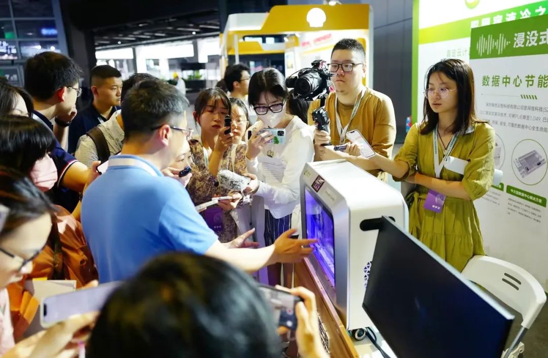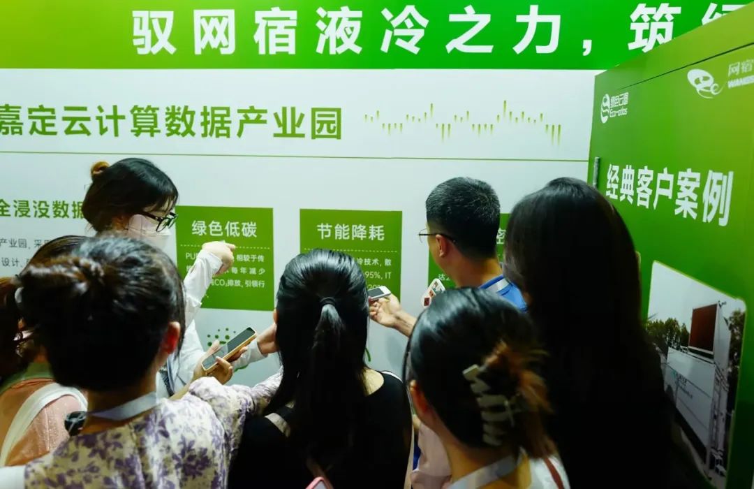 此次碳博会,绿色云图展示了三款液冷机柜,让业界与社会公众近距离了解液冷技术的运行原理以及优势所在,深刻感受到网宿液冷之力赋能低碳之路的生动实践。颠覆传统数据中心”庞然大物”的形象,一台台精小、美观的液冷机柜,吸引参观人群络绎不绝。而相较于传统数据中心机房的嘈杂与闷热,现场液冷机柜运行几乎静谧无声,更令人称奇。液冷技术成为这场盛会上最为亮眼的新科技之一,引得媒体争相报道。