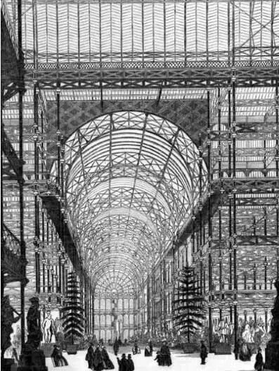 “天时、地利、人和”催发了第一届世博会在英国诞生。由于时间紧迫,无法以传统的方式建造博览会建筑,组委会采用了园艺家帕克斯顿的“水晶宫”设计方案,帕克斯顿以在温室中培养和繁殖维多利亚王莲而闻名。并擅长用玻璃和钢铁来建造温室。他采用了装配温室的方法建成了“水晶宫”玻璃铁架结构的庞大外壳,建筑总长度达到563M(1851FT),用以象征1851年建造;宽度为124.4m,共有5跨以2.44M位一单位,其外形为一简单的阶梯形长方体,共有一个垂直的拱顶,各面只显出铁架与玻璃,没由任何多余的装饰,完全体现了工业生产的机械特色。在整座建筑中,只用了铁、木、玻璃三种材料,没由任何多余的装饰,完全体现了工业生产的机械特色。从1850年8月到1851年5月1号结束。水晶宫的出现轰动一时,人们惊奇地认为这是建筑工程的奇迹,博览会结束后,“水晶宫”被移至异地重新装配,1936年毁于大火。“水晶宫”是20世纪现代建筑的先声,是指向未来的一个标志,是世界上第一座用金属和玻璃建造起来的大型建筑,并采用了重复生产的标准预制单元构建。与19世纪其它工程杰作一样,在现代设计的发展中占有重要地位。但“水晶宫”中展出的内容却与其建筑形成鲜明对比。各国送展的展品大多都是机制产品,不少是为参展特制的,展品中各种各样的历史式样,反映出一种普遍为装饰而装饰的热情。漠视任何基本的设计原则,其滥用装饰的程度甚至超过了为市场生产商品。生产厂家试图通过这次隆重的博览会,向公众展示其通过应用“艺术”来提高产品身份的妙方。这显然与组织者的原意相悖。有些展品把相对来说无足轻重的家用品作为建筑性的纪念碑来设计,这是小题大做。例如法国的一个油灯,灯罩用金银支撑极为繁复的基座支撑。这种把诸如灯、表类产品作为建筑来看待并不是新的发展,18世纪末法国帝王风格的设计者们就常常这样做,但现在的设计师们似乎失去了所有自制力。女士们做手工的工作台成了洛可可分割的藏金箱,罩以一组天使群雕。花哨的桌腿似乎难以支撑其重量。设计者们试图探索各种新材料和新技术所提供可能性,将洛可可风格推到了浮夸的地步,显示了新型奇巧的装饰方式。还有一些展品表现了对形式和装饰的别出心裁的追求。如鼓形书架,可以沿中心水平轴旋转,每层搁板均挂在两侧圆盘上,这样搁板就可以连续地以使用者方便的位置出现。这件暑假侧板上的花饰和狮爪脚同样是可以把一些细微末节不适当地大加渲染。其结构全部由铸铁、钢或者两者的符合材料制成。金属家具并非美国首创,在拿破仑战争中,金属被广泛用于制作战时家具。但是,这把椅子中确实体现了一种对家具基本结构的重新考虑。可惜的是这位美国设计师的功能意识未能贯彻始终,因为用以支持连杆进而支承弹簧的金属腿采用了精致的卷涡形。