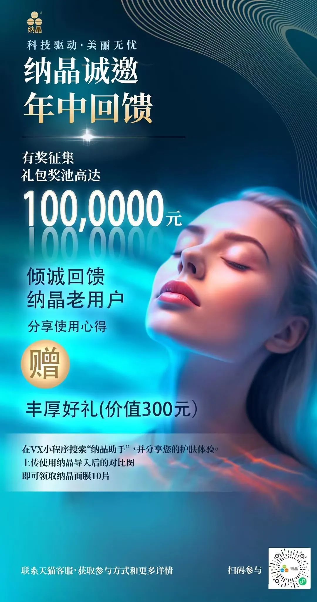 1,在vx搜索“纳晶助手”,并分享您的护肤体验~上传使用纳晶导入后的对比图即可领取纳晶面膜10片