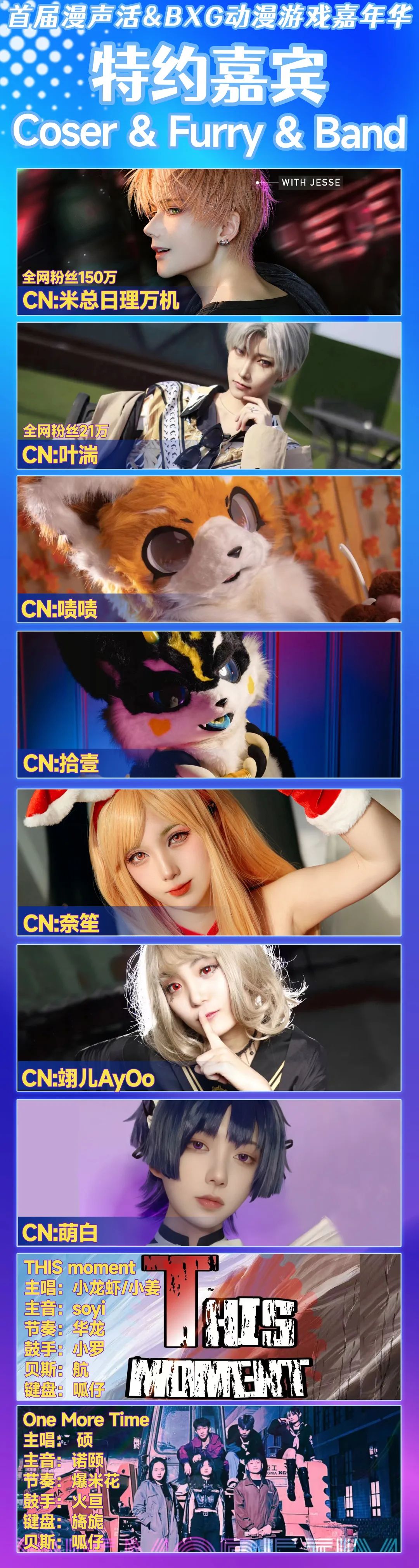 本次会展特邀“超人气嘉宾”米总日理万基 ,叶湍,空降会场,超人气FURRY嘉宾拾壹&啧啧,平面嘉宾,奈笙,萌白,翊儿等,更有特邀乐队在18日晚间带来精彩LIVE演出,喜欢他们的小伙伴千万不要错过!