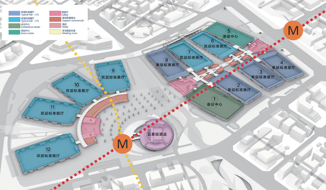 杭州大会展中心是临空会展商务区域内首个标志性、引领性重大项目。项目共有 12 个展馆、18 个展厅,净展面积约 30 万方,建成后净展规模将位列全国第五。其中一期呈鱼骨式布局, 共有 8 个展馆、10 个展厅,共可设置 5900 个标准展位。