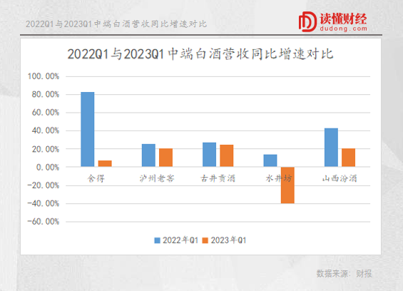 一季度,茅台以及百元售价以下的白酒企业,营收同比增速都较为稳定。而中端白酒品牌或营收同比增速下降明显,或出现了负增长,如舍得营收同比增速由去年同期的83.3%下降到今年一季度的7.3%。水井坊营收同比增速去年还有14.1%,而到了今年一季度其营收同比下滑40%。