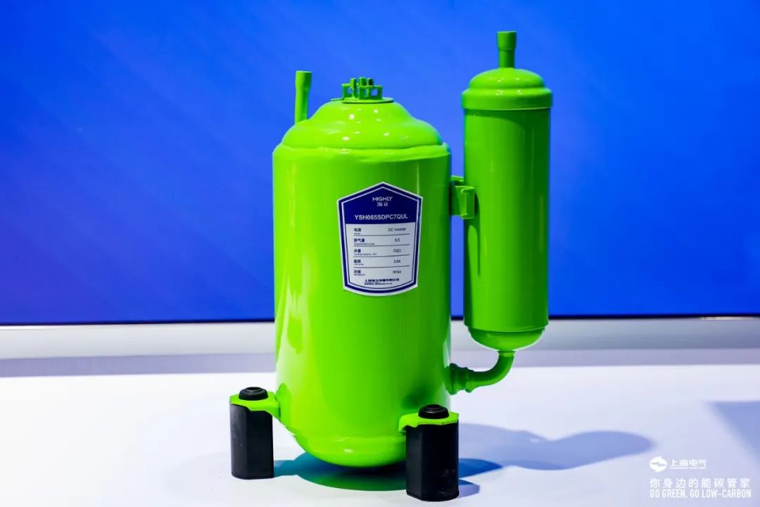 海立围绕低碳高效、绿色环保、资源节约的技术趋势,生产研发各种冷媒、不同电压和频率的空调压缩机。此次展出的二氧化碳热泵压缩机采用天然工质二氧化碳作为制冷剂,二氧化碳对臭氧层的破坏潜能为0,温室效应指数为1,这意味着每公斤二氧化碳冷媒释放到我们的大气中比值是1比1,仅为410A冷媒的1/2000,具有良好的环保特性;开发二氧化碳压缩机用冷冻机油及绝缘材料,解决了超临界状态下材料兼容性问题;采用壳体、储液器结构、泵体参数优化技术,开发类金刚石耐磨涂层,使压缩机具有耐压、耐磨、高可靠性等优点。