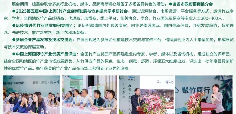 2023第五届上海国际竹产业博览会,竹产业的巅峰盛会,7年沉淀,从未中断。7月5日-7日,在上海新国际博览中心盛大召开。300+展商,汇聚竹日用品、竹建材、竹家具、竹工艺品、竹食品等行业前沿产品、与厂家面对面交流。36000+专业采购商共襄盛举,包含经代理商、加盟商、商超、百货、酒店、民宿、园林、进出口贸易等,此外还有政府机构、行业协会等业内人士参与观展。竹博会集品牌推广、市场拓展、资源整合、趋势洞察、高端论坛为一体的一站式采购平台。现场将配套中国竹产业创新发展论坛、政府招商推介会、企业新品发布会、CBIE竹产业主题沙龙、竹产业优质产品评选等活动帮助展商抢占市场先机,期待与您魔都相聚!