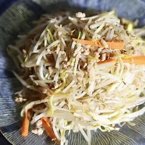 豆芽炒肉丝:绿豆芽20g、黄豆芽25g、胡萝卜2g