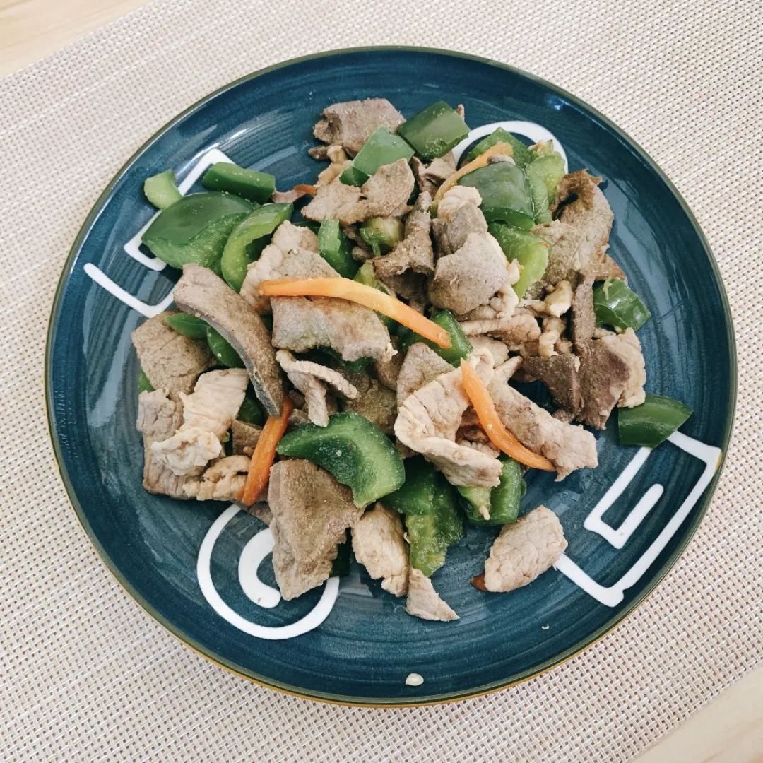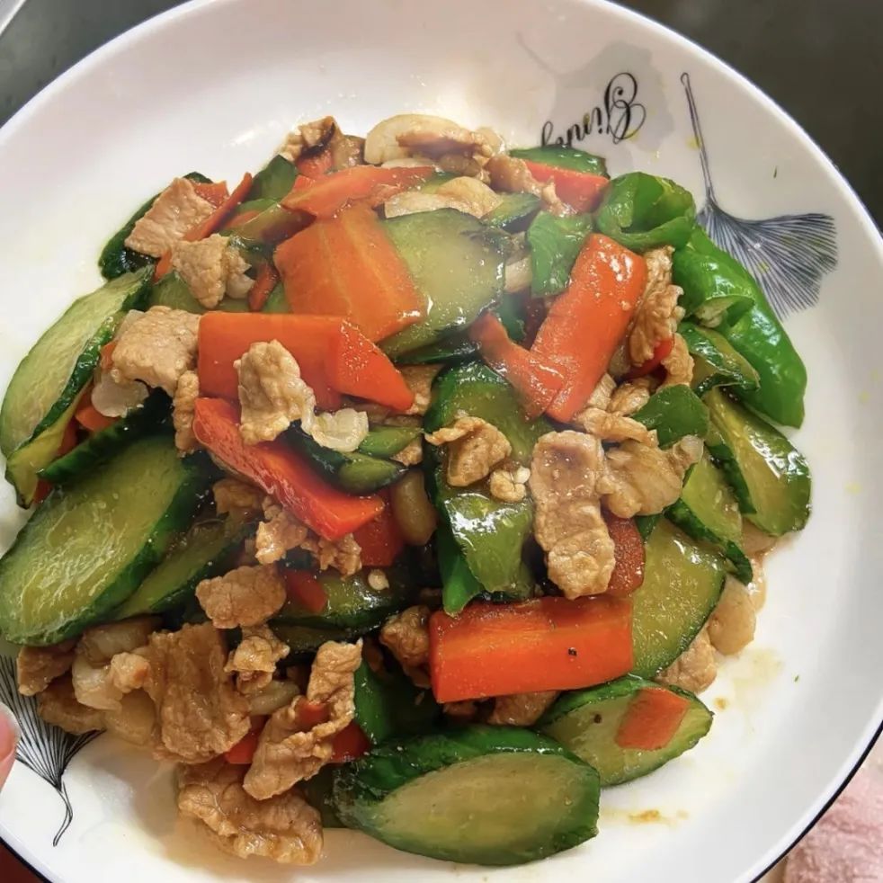 爽肉炒黄瓜:猪肉10g、胡萝卜5g、黄瓜40g