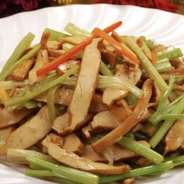香干炒芹菜:豆腐干10g、胡萝卜5g、芹菜茎40g
