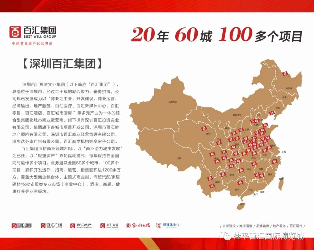 深圳百汇投资实业集团,总部位于深圳。经过二十余载的凝心聚力、奋发拼搏,秉承“商业助力城市发展”的核心理念,全面开拓国内市场。业务遍及全国60多个城市,100多个项目,先后荣获“中国最佳商业地产开发企业”、“中国优秀民营企业”、“中国专业市场领军型企业”等多项殊荣。