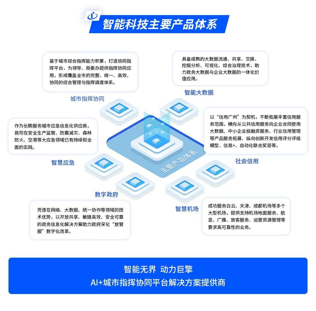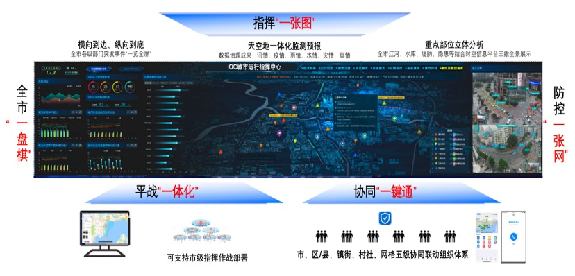 智能科技基于二十余年服务智慧城市、智慧政务、数字企业、大型活动、大型机场的指挥协同调度系统的研发及服务经验,以建设纵横一体的指挥协同为整体目标,提供了包括基层治理、一网统管、城市应急的解决方案,平台集成了数据采集到物联网汇聚平台、大数据中台以及综合应用服务平台,打造了一个城市数据底座加城市管理一张图的智能系统。
