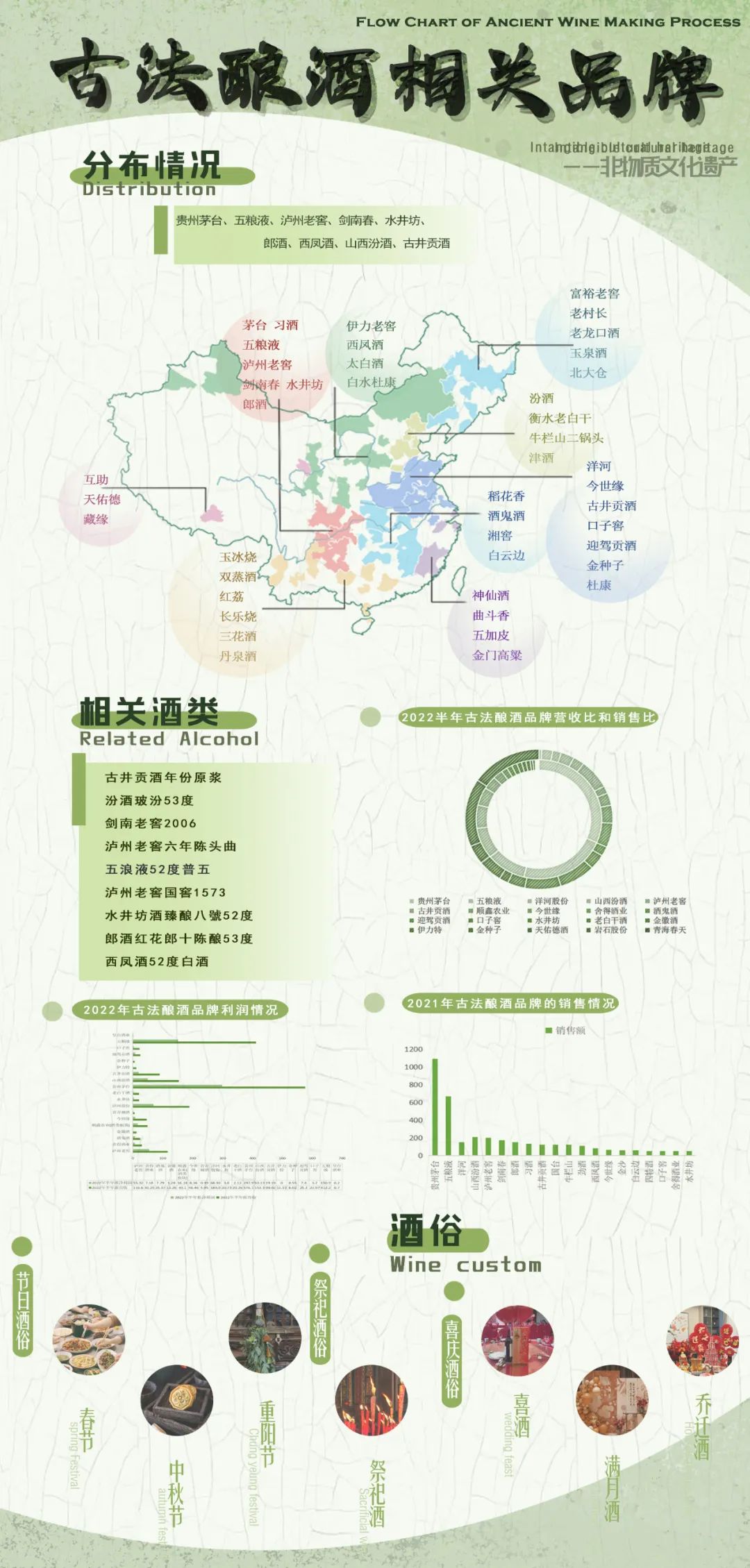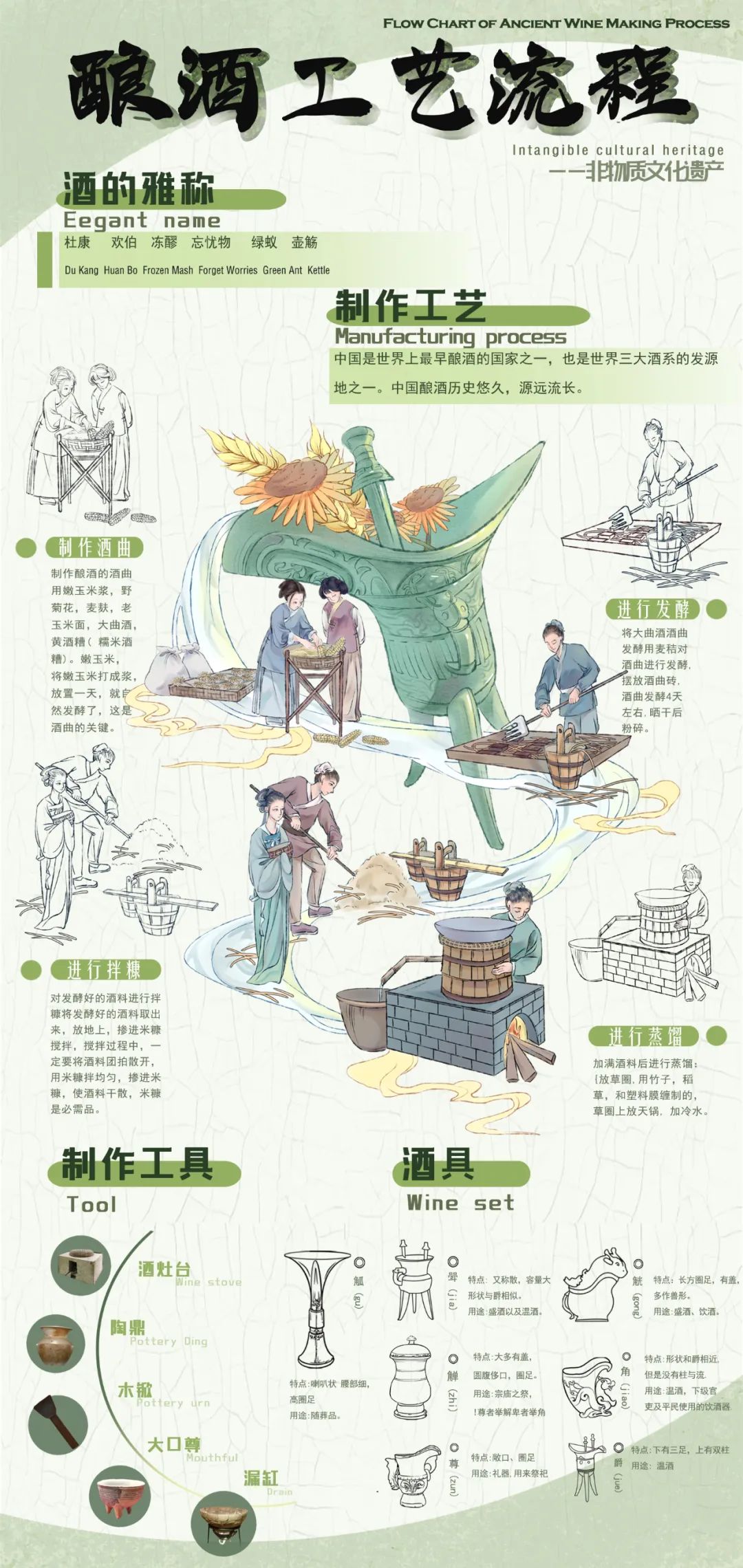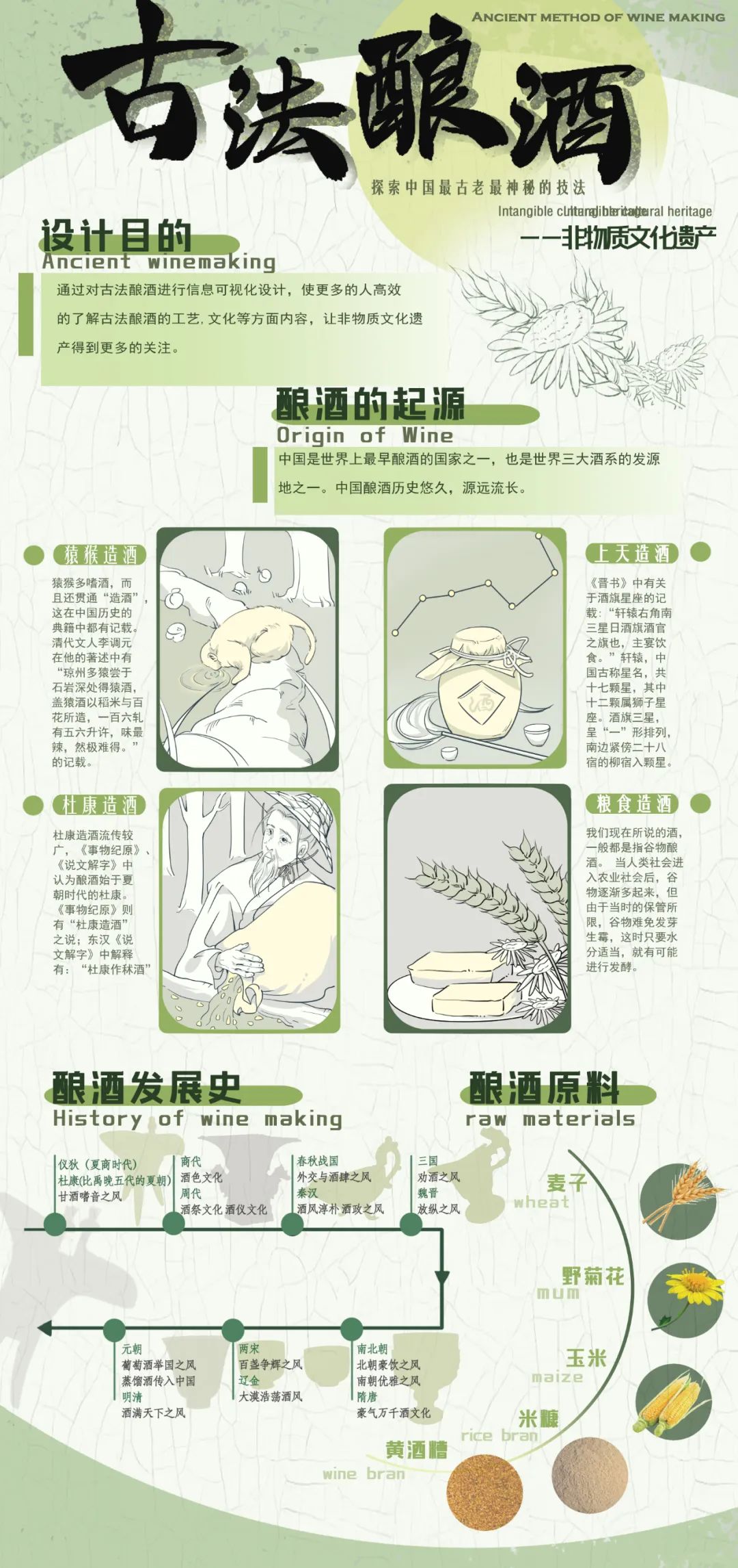 古法酿酒是非遗之一,本次设计通过对古法酿酒进行信息可视化设计,使更多的人高效的了解古法酿酒的工艺、文化等方面内容,让非物质文化遗产得到更多的关注。以下内容,是对酿酒的信息可视化设计介绍。