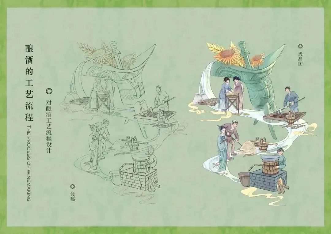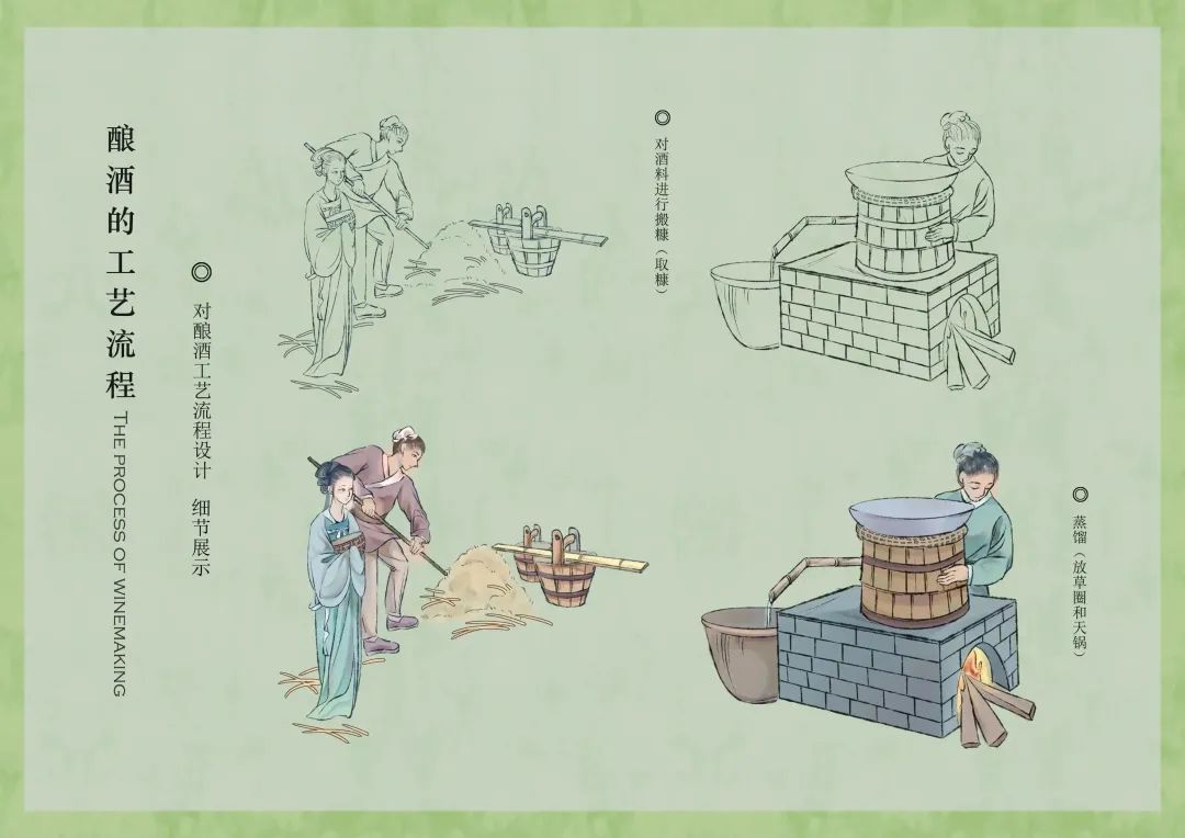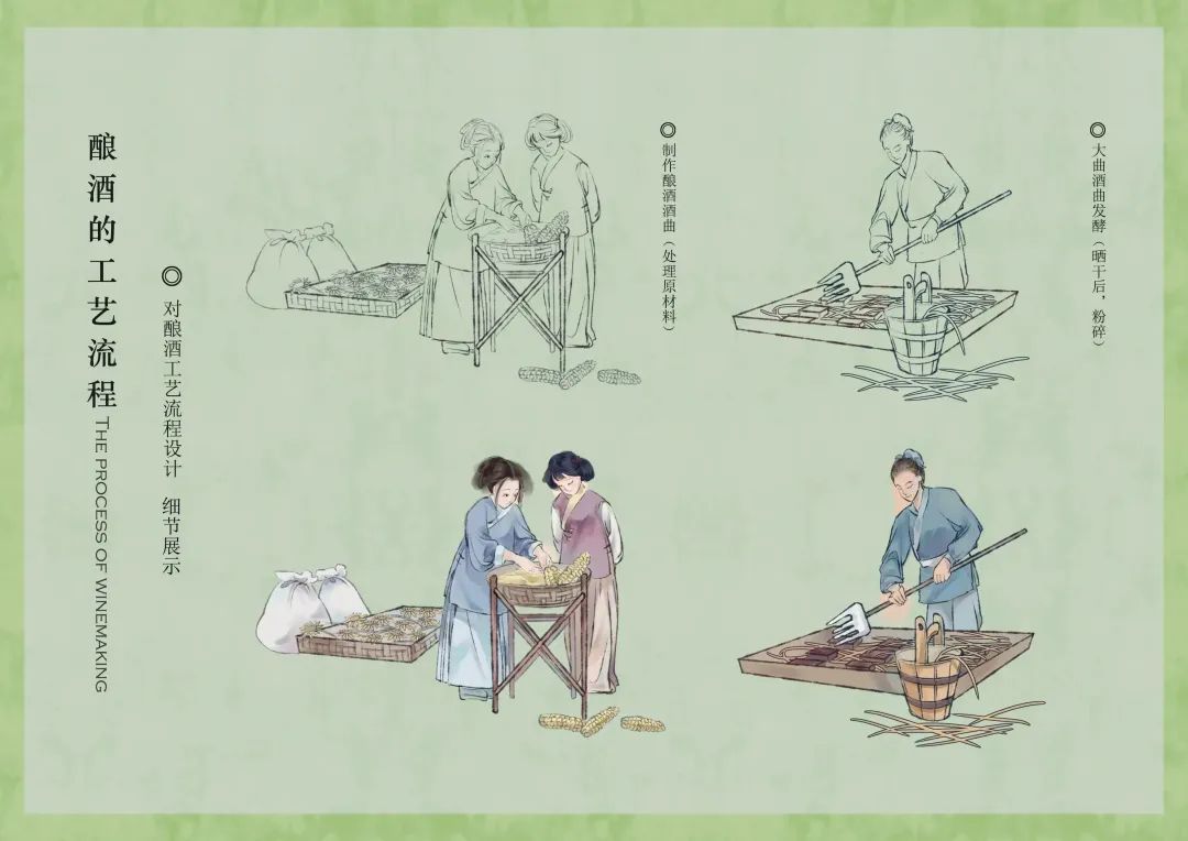 酿酒的工艺流程从挑取材料到最后的蒸馏贮存,其中步骤有很多;为了将酿酒关键步骤直白清晰的展示出来,本次酿酒的工艺流程设计,提取了制作酒曲、酒曲发酵、拌糠、蒸馏四个流程进行插画设计。