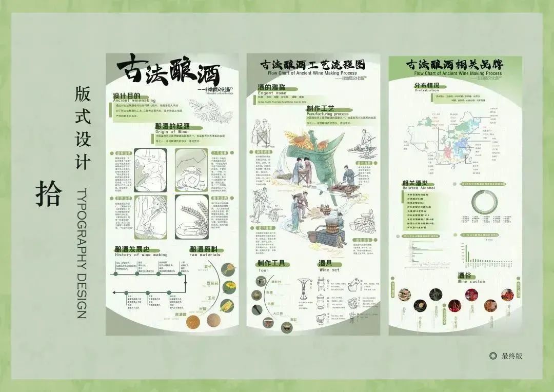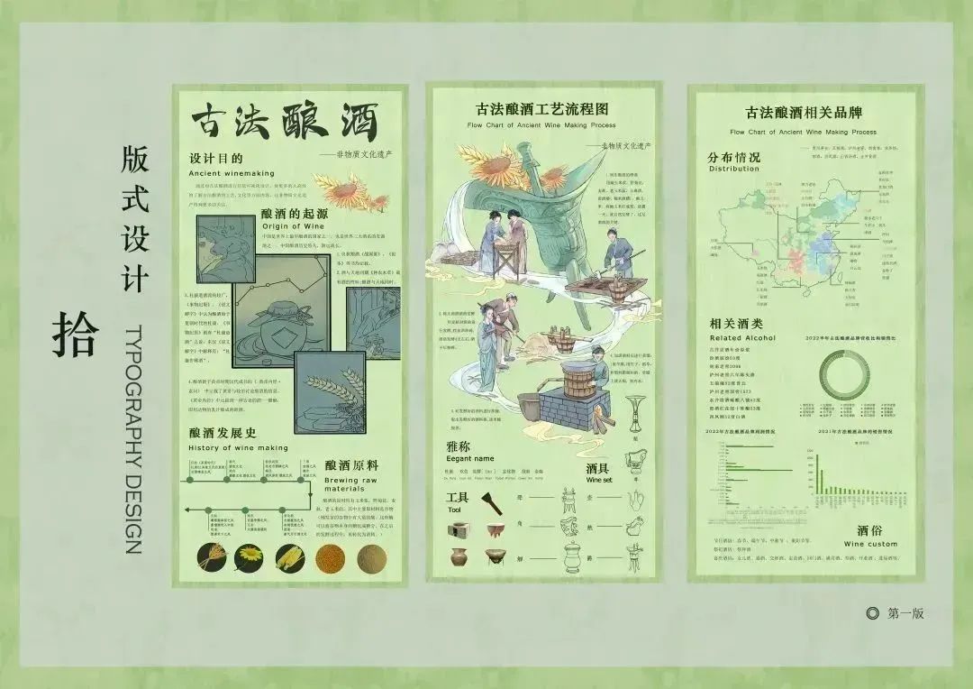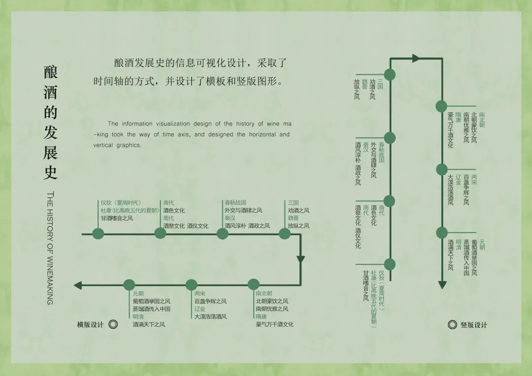 通过对古法酿酒的调研和资料的梳理,本次设计的思路是从古法酿酒的起源、发展、工艺流程、制作工具、相关酒具和品牌等信息进行可视化设计。