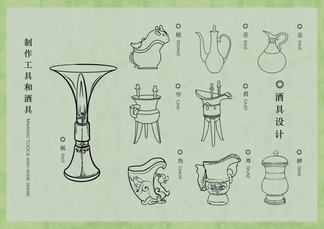 酒具伴随着酿酒的发展,其历史也源远流长,从先前的骨质酒具到现在的玻璃杯等,酒具有很多很多种类。本次酒具信息可视化设计,从中提取了以下八种酒具作为代表,进行了插画设计。