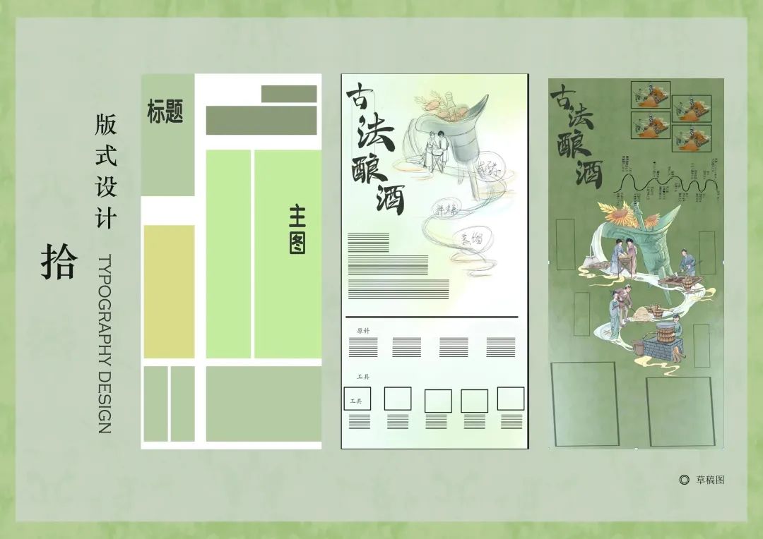 本次设计整体采用水彩古风的基调,以中国最初的酒的颜色黄绿色为主色,将古法酿酒工艺流程以插画的形式表现出来作为主图,用条漫的方式展现早期古法酿酒的起源传说,也对历史发展酒具酒俗,遗留品种等方面进行可视化设计,使更多的人高效的了解古法酿酒的工艺、文化等方面内容。